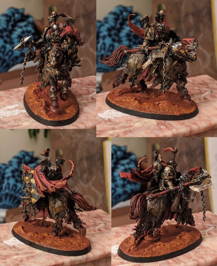 I've been really enjoying using Crusade as an excuse to kitbash and paint units that would never see the light of day otherwise; this here is my Chaos Lord on a Juggernaut of Khorne, Haemodrion the Forgemaster. I'm trying to achieve a gritty, tarnished look by using Ryza Rust and Nihilakh Oxide as sort of 'anti-highlights', making the underside of lit planes pop with whorls of color before a heavy wash of Agrax unifies and smooths transitions.