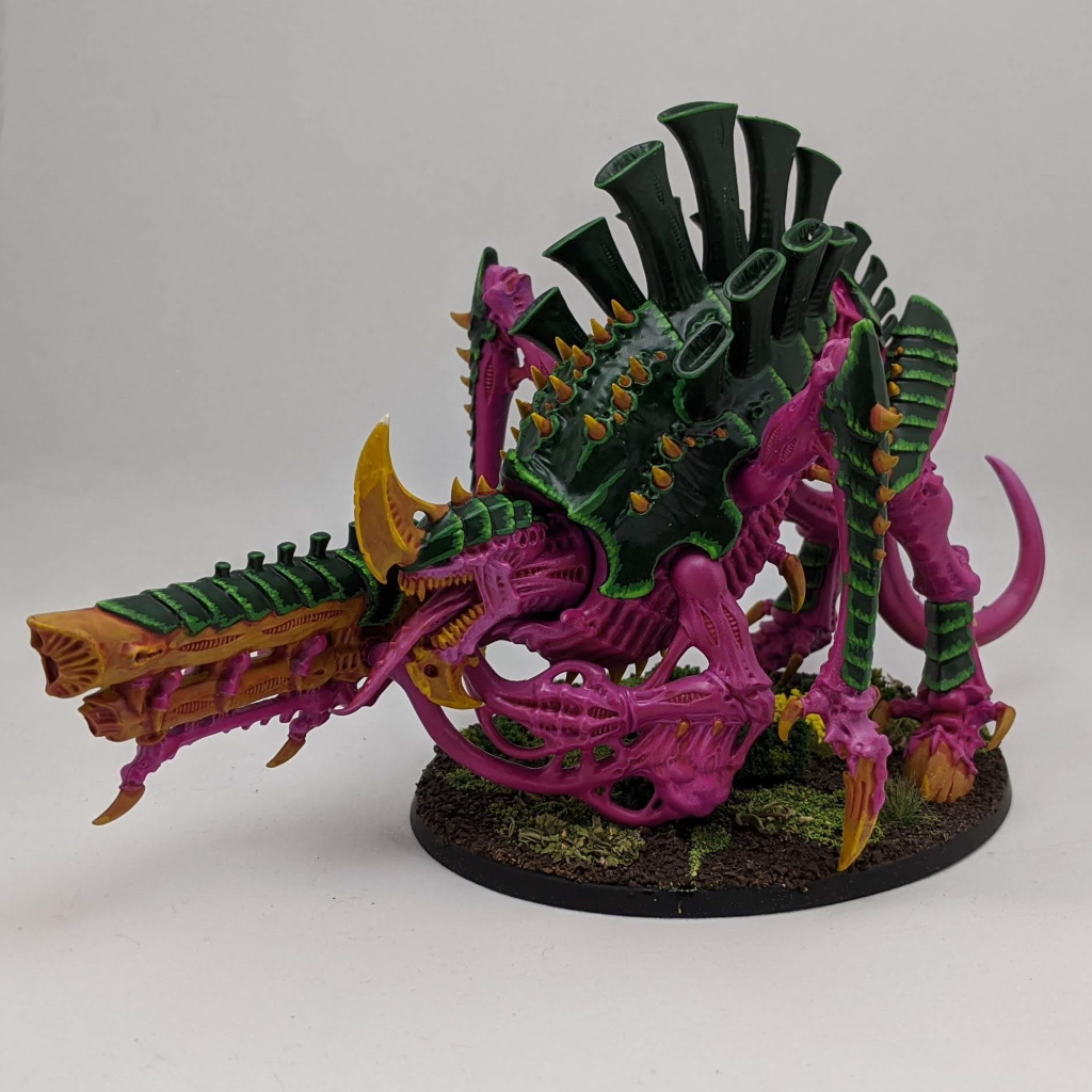 I finished up a Tyrannofex for my hobby group's slow grow - this is the biggest monster I've painted so far for my Tyranids and I feel like I'm getting into the groove with the paint scheme. I also added basing to him and all the models I've painted so far following a jungle basing guide on this very website. As a bonus the model got featured on Games Workshop's Hobby Roundup, which made me grin from ear to ear for a solid 6 hours.