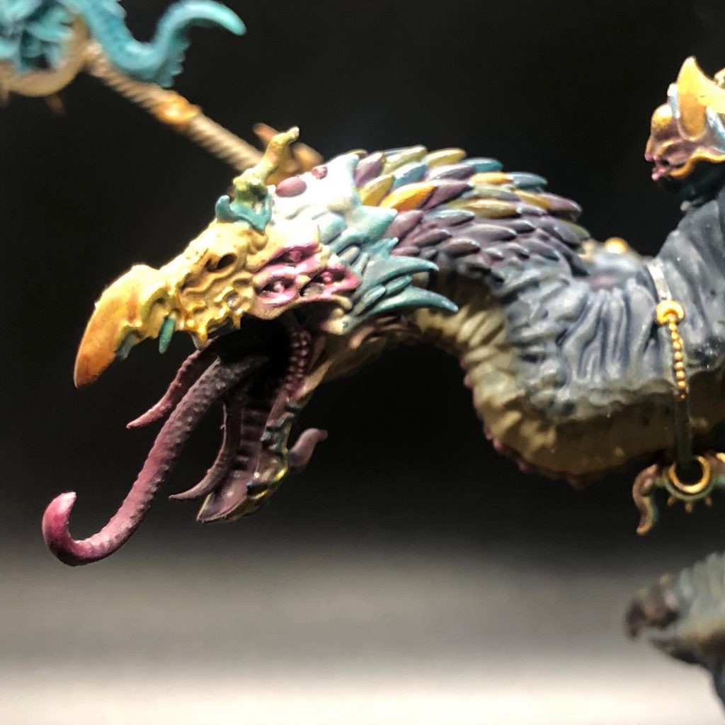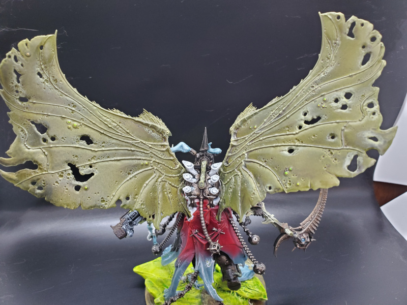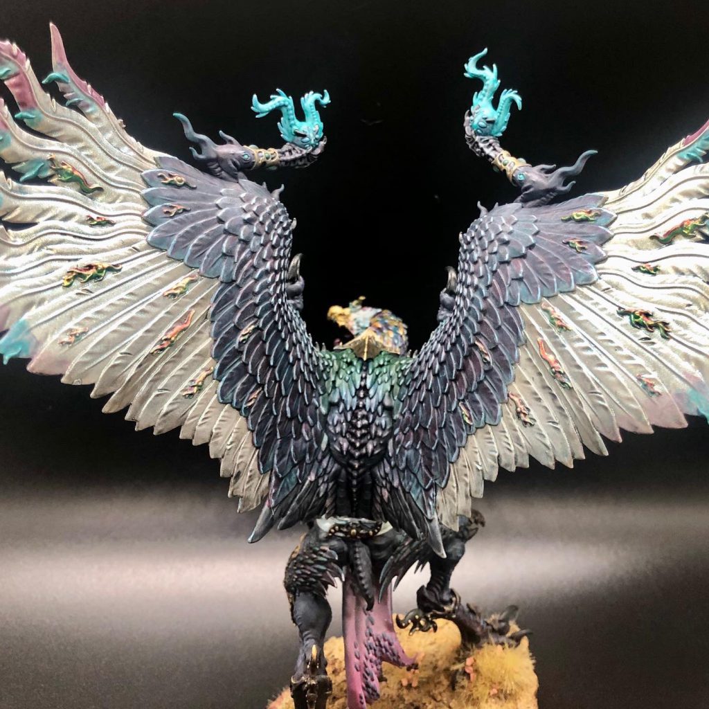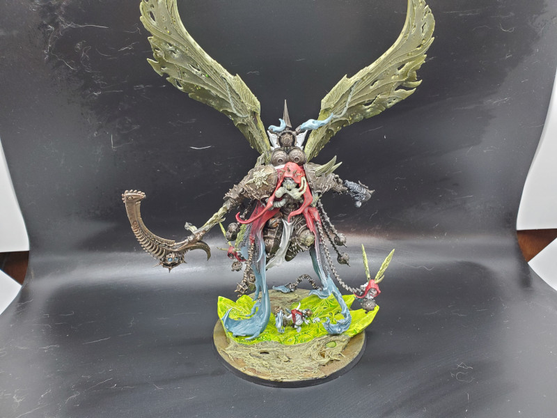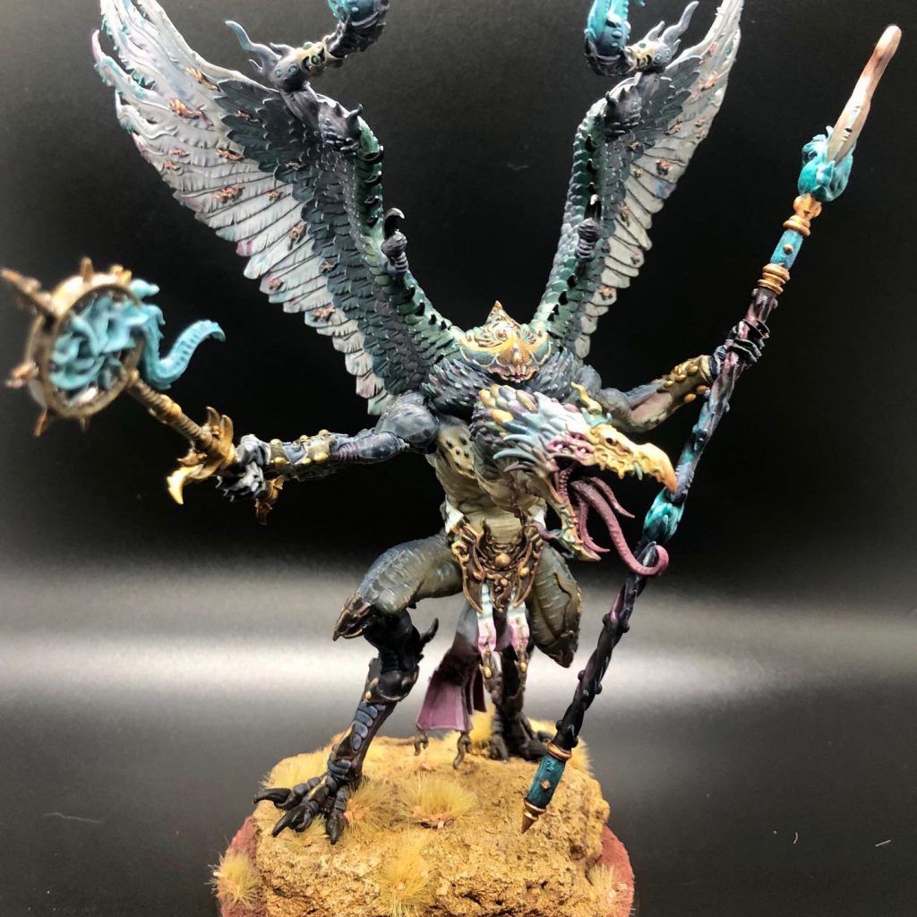 9th Edition might be the all time greatest time for the Lord of Change with the additions from Engine War and Exalted Demon rules. As the warlord of my Chaos Daemons army, I wanted to go big on this model. This bird represents exactly 1 year into painting and it's a great demonstration of the detail and blending you can do with an airbrush, contrast paints and a fun base. 90% of this model was done strictly with Citadel contrast paints and lots of blending. Turbo Dork pearl coat was used for the white part of the wings which shimmer with a blue ethereal reflection in person. Arms were magnetized for transport and the base was a chunk of concrete so there is a considerable weight to it. This Lord of Change feels more like a trophy I gave myself for a year of sticking with the hobby.