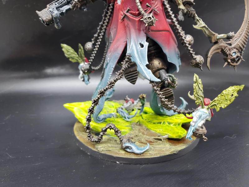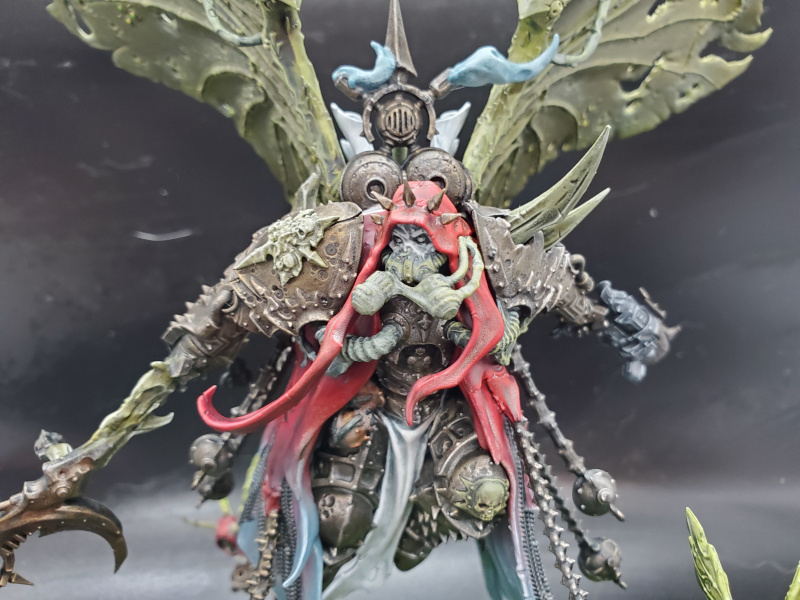 This month, I completed Mortarion and a Biologus Putrifier conversion. For Mortarion, I really got into blending using my airbrush and tried to blend his robes from crimson to a spectral blue. The armor is the new Cryptek Armourshade over Leadbelcher, which was highlighted Vallejo Old Gold and then silver on the top of the armor. The rock is painted with Tesseract Glow. For the rest of the base, I mixed together PVA glue and super glue and then painted following TheChirurgeon's Nurgle paint guide. I left out the optional puffs of smoke and a couple of Nurglings because they made it busy and I goofed up his back, so the puffs wouldn't actually fit on the fleshy smoke stacks.