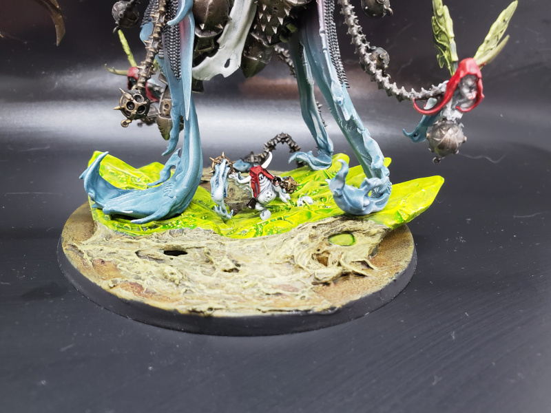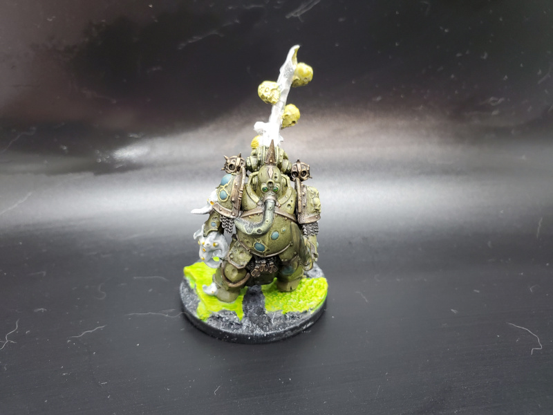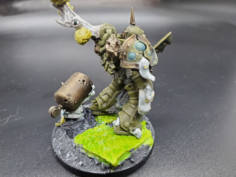 For the conversion of the Putrifier, I used a plague marine from the Death Guard paint set. I used the leftover staff bit from Mortarion's sprue and attached some zombie heads to create his Blight Rack. I thought the Nurgling would fill out the base nicely for him, which was done with bits of sculpy that had a Green Stuff Roller pressed into it and Astrogranite Debris.