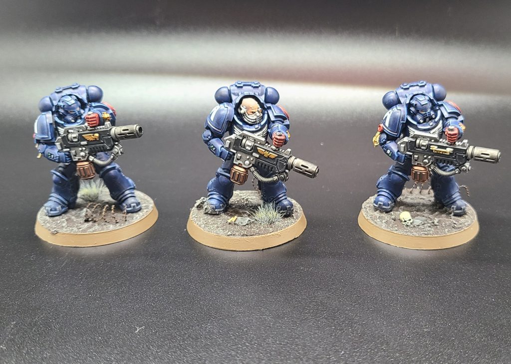 Before and after the Inceptors I painted up the first two units of the Hounds, a Phobos Lieutenant and a squad of Assault Intercessors. I tried to do a sort of ash-smeared look on the Lt’s face to imitate Northern European tribal practices, and clearly did not succeed. C’est La Vie. Or rather, as the Hounds would say: So ist das Leben. I’m also wrestling with the idea of black accents and such being indicative of 1st company/veteran status but I’m not yet sure how I feel about it. They’re waiting on decals and weathering since I need to custom chapter icon from a 3rd party, and I don’t like starting a hobby step and not being able to finish it so there you go.