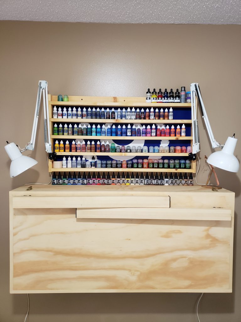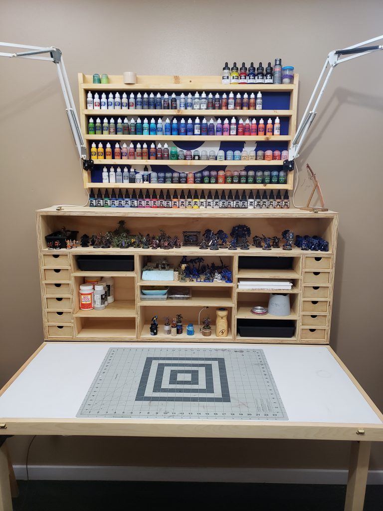 I built this as a hobby desk. Combined my two hobbies minis and woodworking. Used plans from a woodworking course I'm taking to make a dropdown work station. The desk took up a huge chunk of hobby time, so the mini swap stuff is all I've painted recently.