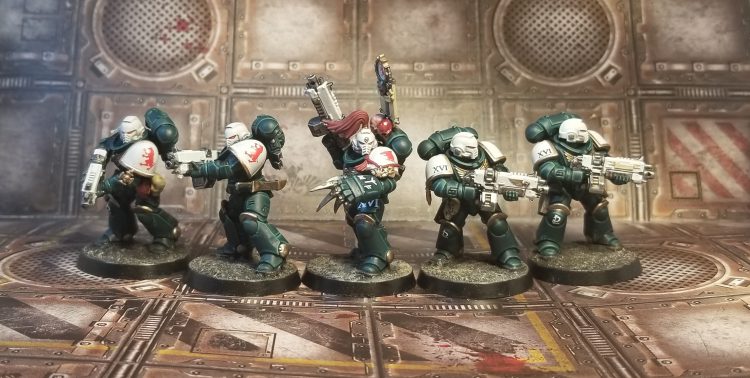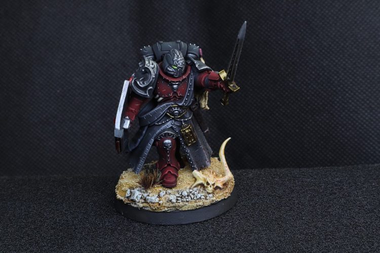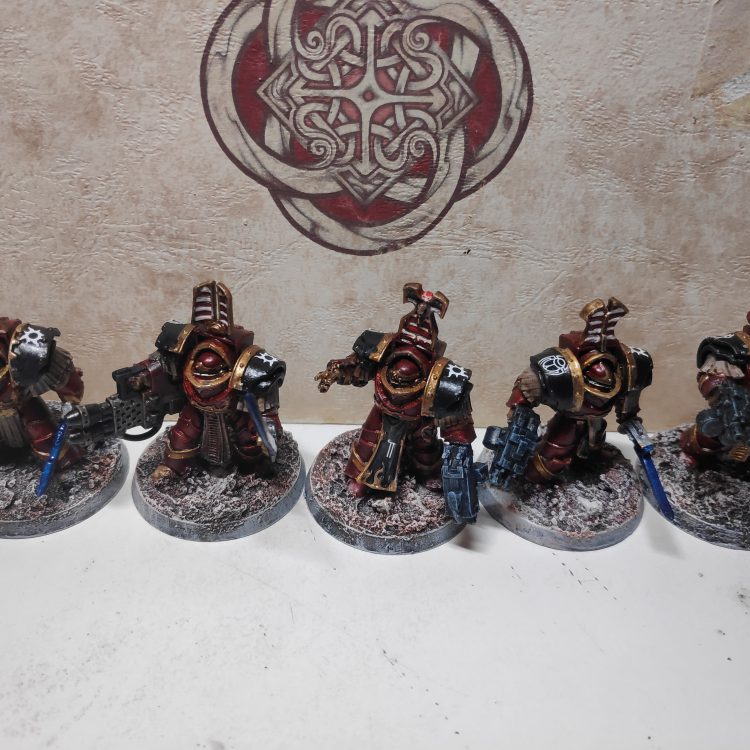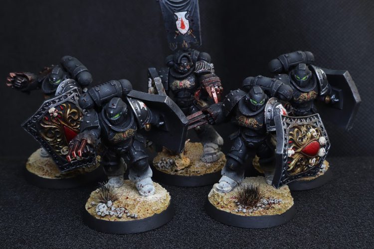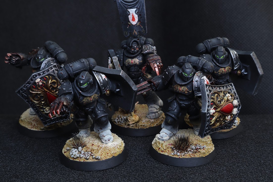 I then spent far, far too long on a squad of Company Veterans. These guys were an absolute blast- I wanted them to really stand out as a unit of grizzled warriors that have developed their own unique outlook after centuries of service. As a starting point I went back to the original Rogue Trader era art for Flesh Tearers which showed them in an all black scheme, and to push this further I made their chapter icon and backpack banner a homage to the Knights of Blood since in my mind these guys are veterans of the Devastation of Baal where they would have encountered the doomed chapter. Next, looking at the shields I got from Scalebro they seemed very similar to the iconography from the Forge World Blood Angels transfer set, so I filed off their chest icons to use that instead. Finally to really complete their more knightly look I used shoulderpads from the MK3 marine box and some leftover bladeguard helmets from Indomitus along with shapeways claws as I’m not a fan of the standard ones;