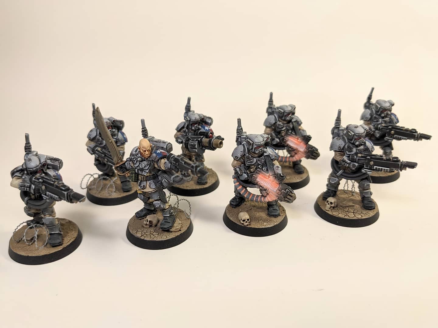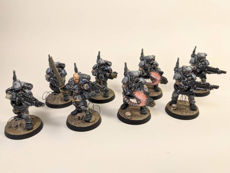 Since the Sons of Sek ritually cover their mouths, I've been avoiding models with exposed faces. This has the side benefit of requiring me to paint a lot of Kasrkin, the best Guard minis ever made.