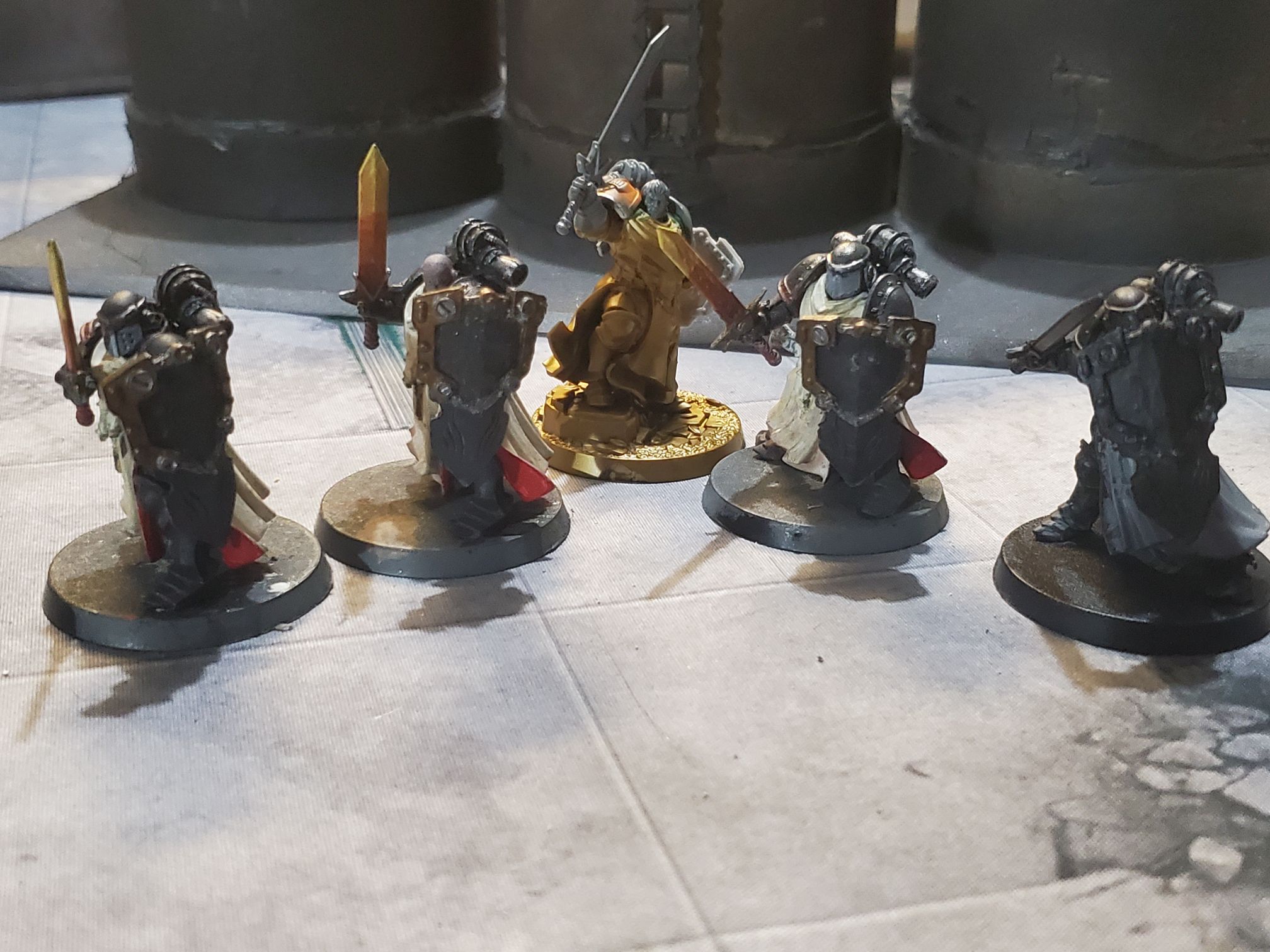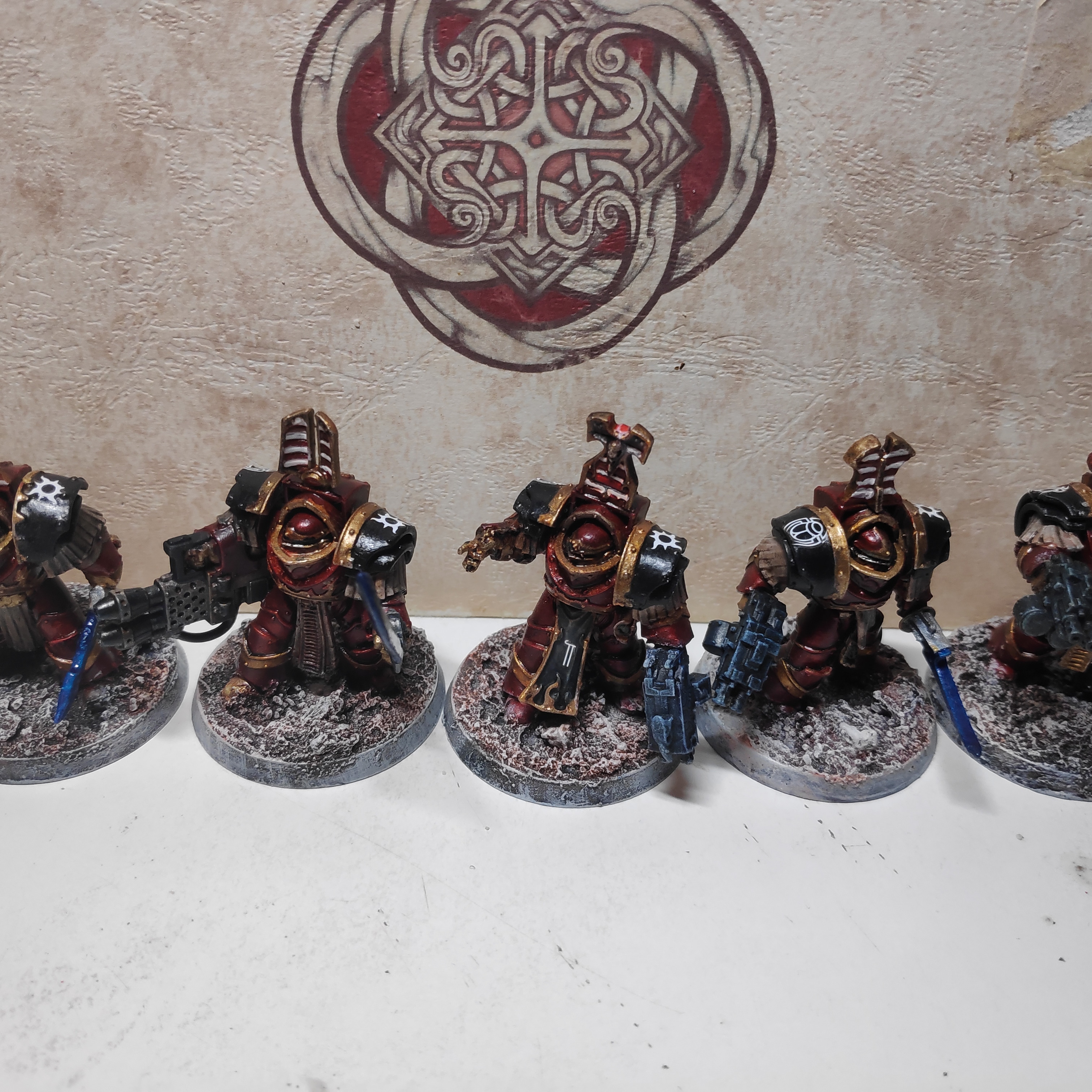 Next I painted a 5 man Intercessor squad for my homebrew chapter the Hounds of Alemannia. They're part of a slow-grow Crusade campaign I'm spinning up with my buddy, so I've been putting a lot more effort into these guys. I want to really lean into the narrative of the campaign, so I've had a lot of fun thinking way too much about who gets what trinket, where a rune is placed, and just how bloody THIS skull is versus THAT one.
