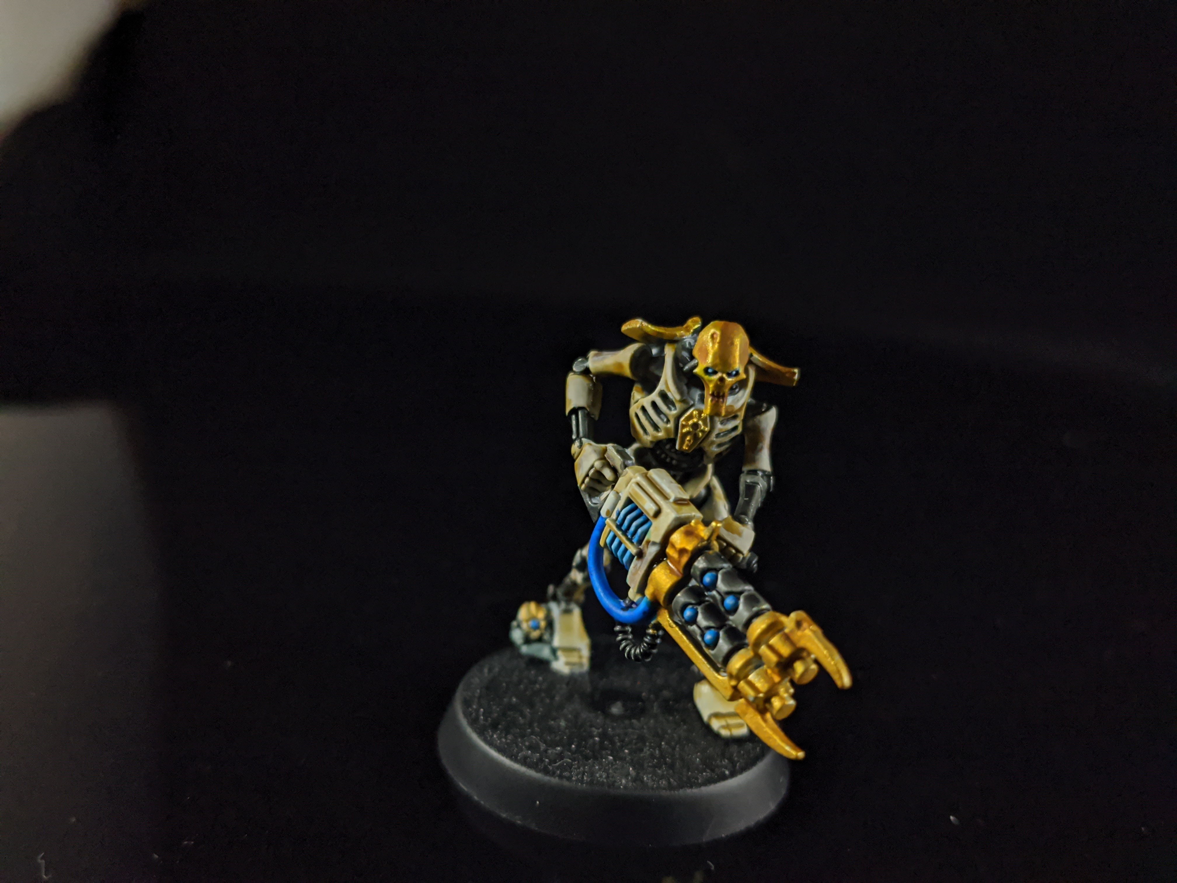 Next, we have a Necron warrior I painted up as a test case for the paint scheme. I wanted to go with something a bit reminiscent of the old Tomb Kings, so I went with bone, gold, and turquoise. Going forward, I'll probably go with more aged bronze for the troops and save gold for the nobility.