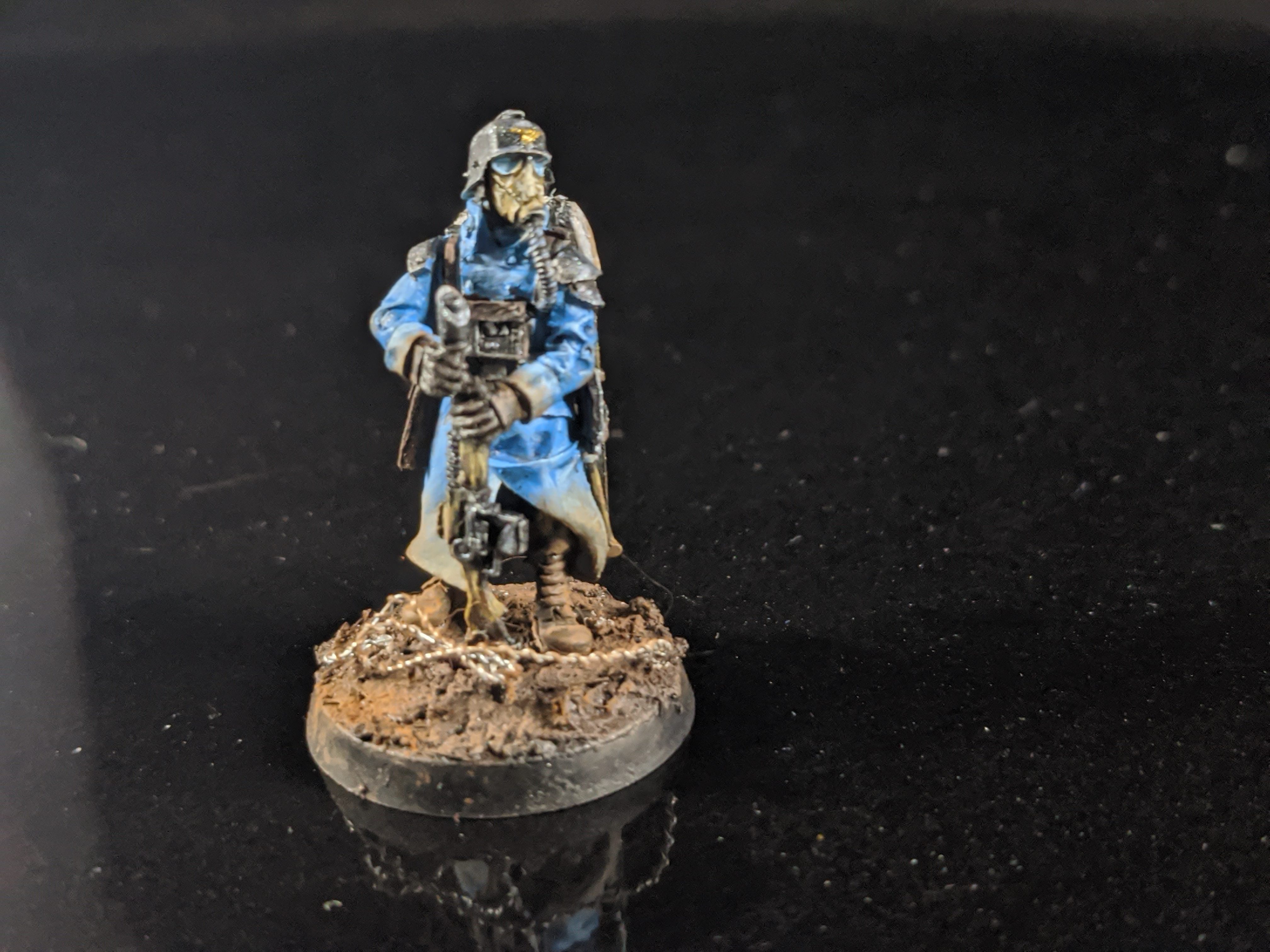 First up, here's a Death Korps of Krieg guardsman I painted up for a friend. She's a big history nerd, and wanted WWI French colors as the basis for the paintjob. The guardsman, or "The Boy," as she calls him, will soon grace her desk.