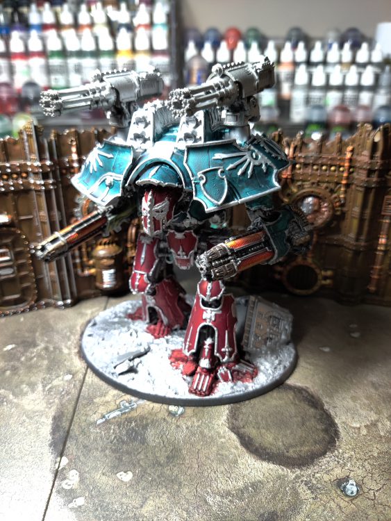 The warlord is getting painted in the livery of Legio Laniaskara, who seem to cover all of my favorite things in both the game and lore (PLAY TITANICUS). The teal on his shoulders is there represent their oceanic home world, and will eventually be covered in a million tiny chevrons. I'm cooking up some cool looking sea monsters for the base, I'm also going to try to do some resin water effects soon.