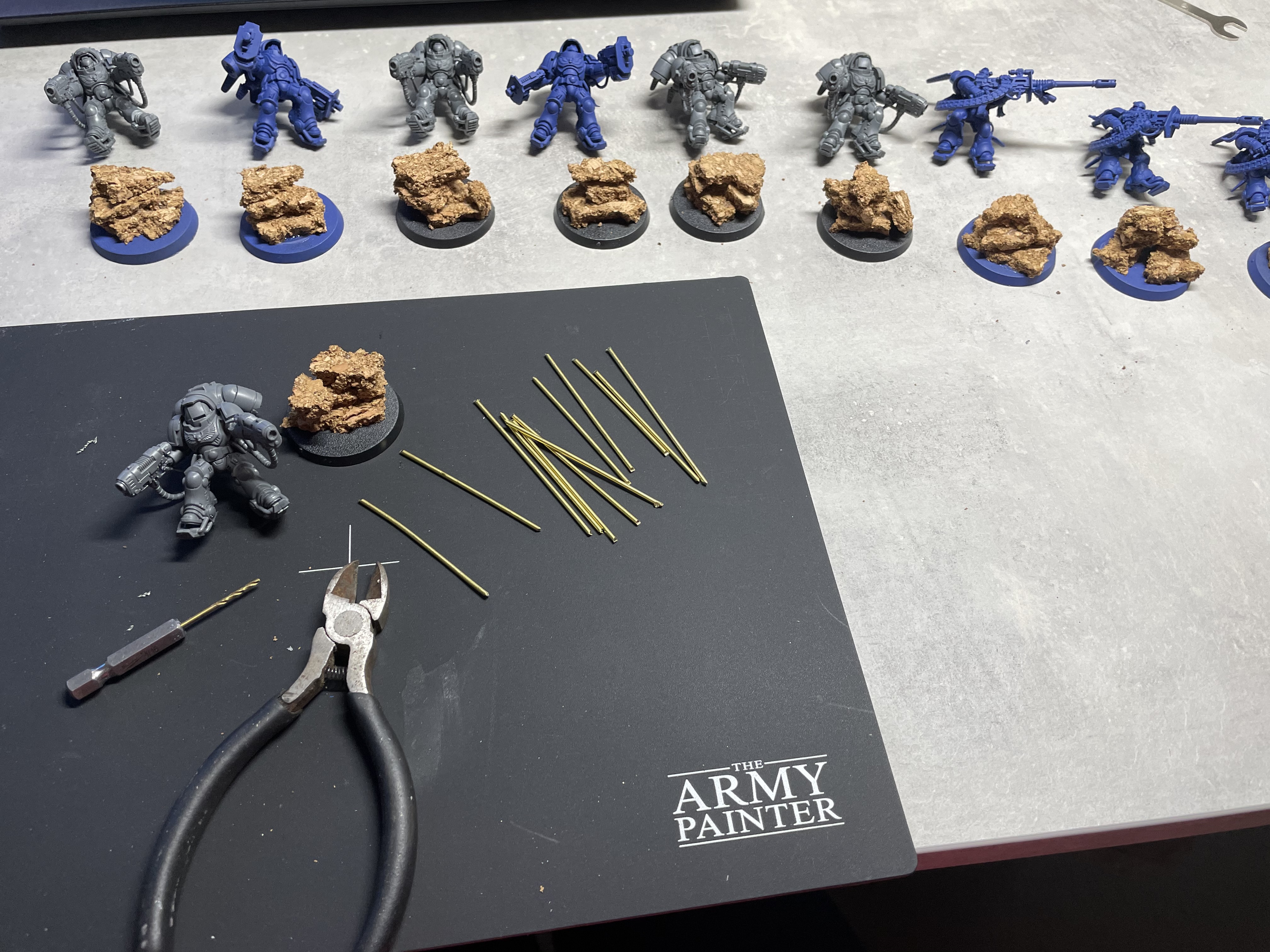 I started with drilling out barrels and rebasing the Inceptors. I opted to replace them with brass rods and cork basing to look like rocks. Specifically, this is the process:
