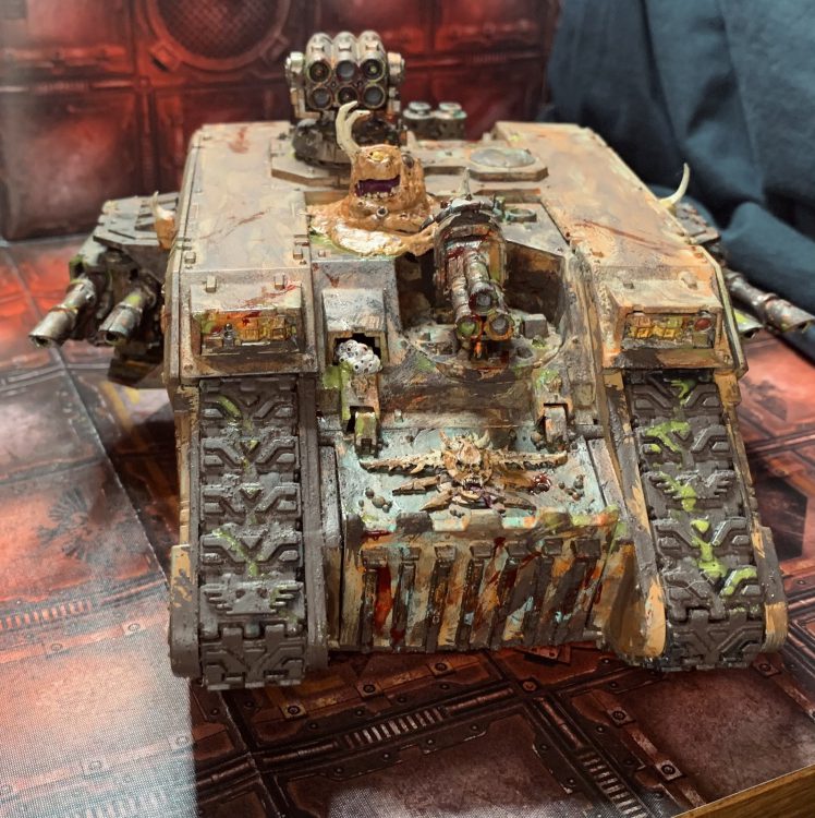 I call this the vector pattern land raider. I was inspired by the old 6th Ed daemonic possession rules for vehicles. I added one of the extra heads from the beast of Nurgle kit, because I was tickled by the idea of a Beast of Nurgle playfully bounding towards enemy combatants looking to play, while possessing a land raider.