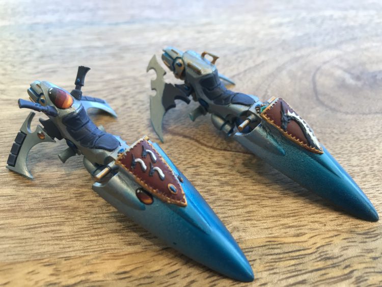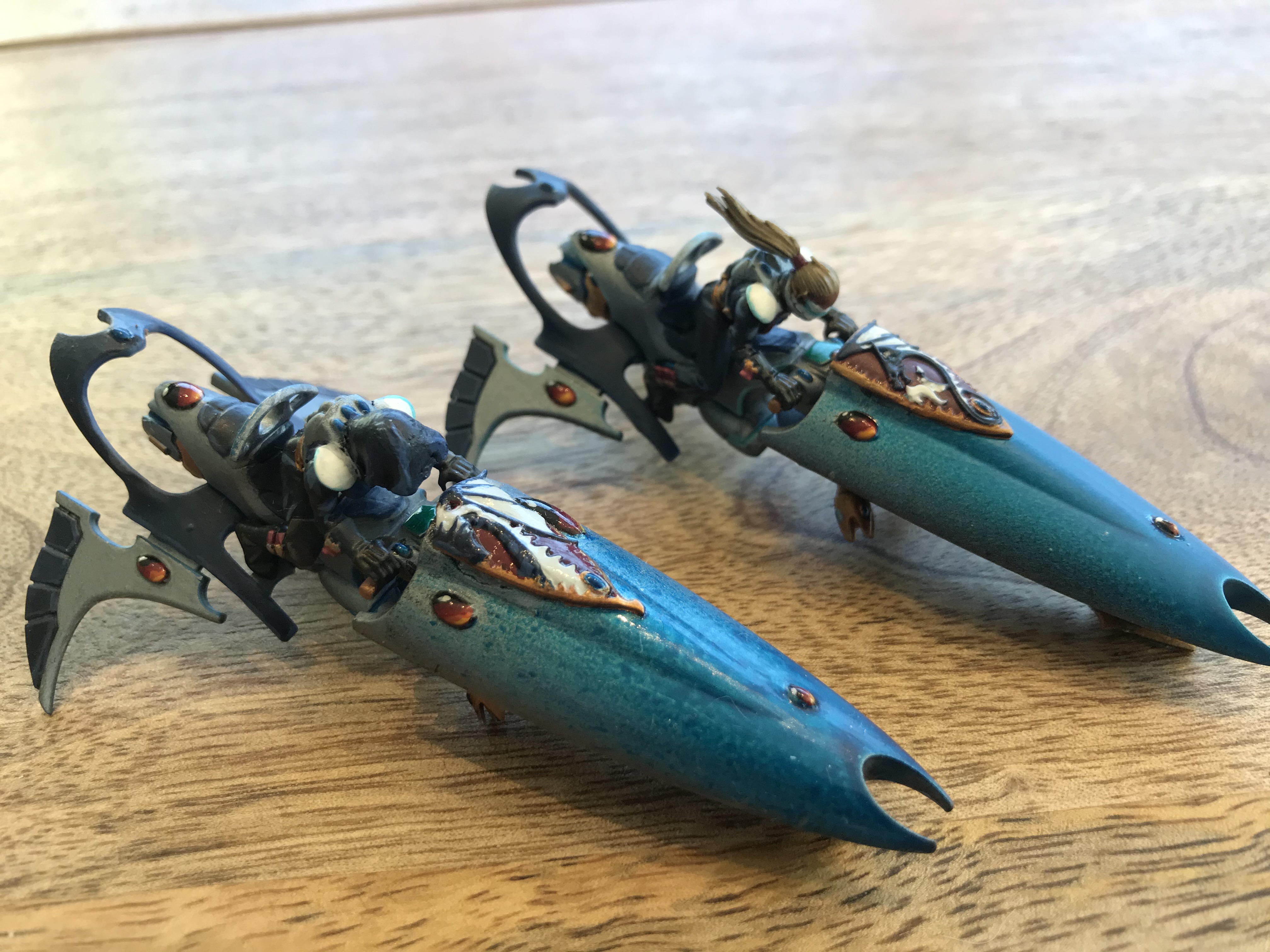 Pilots have been added to the larger finished Dragon Wing jetbikes. Spear-wielding ghosts on the back still pending.