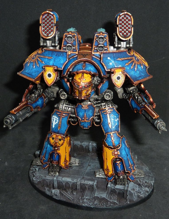 Here's my Adeptus Titanicus Warlord. I wanted to do a starry sky effect for the armour to match the Warp Runner's constellation patterns. I did it with sponging on brighter blues in smaller amounts.