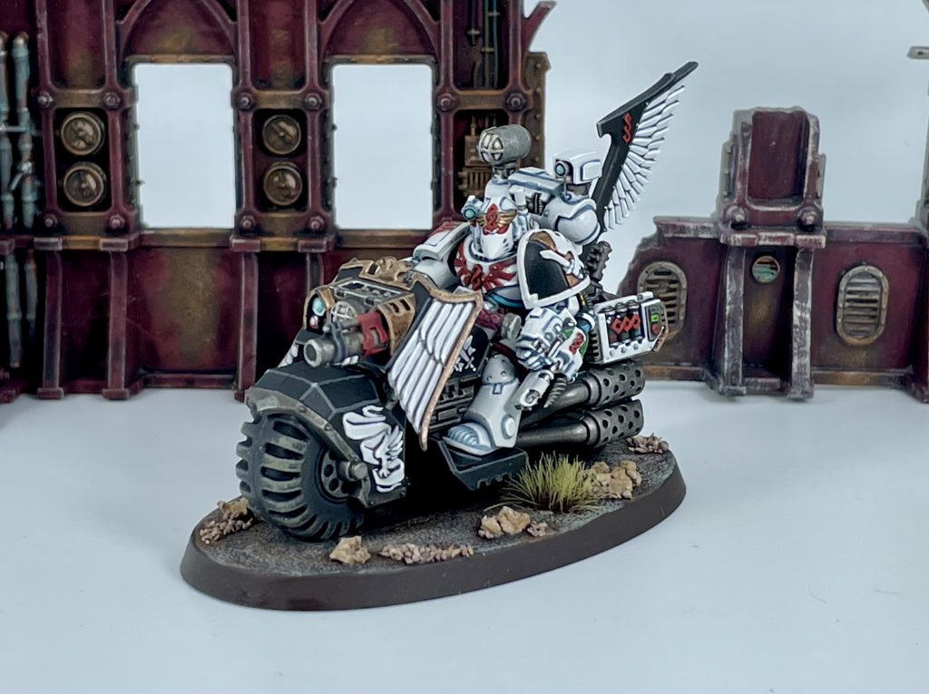 Additionally, I painted up a Ravenwing Apothecary, because what’s better than a medic on a motorcycle? He was a good experiment with painting white using increasingly darker and more precise recess shading, which I think turned out pretty good.