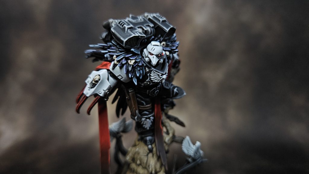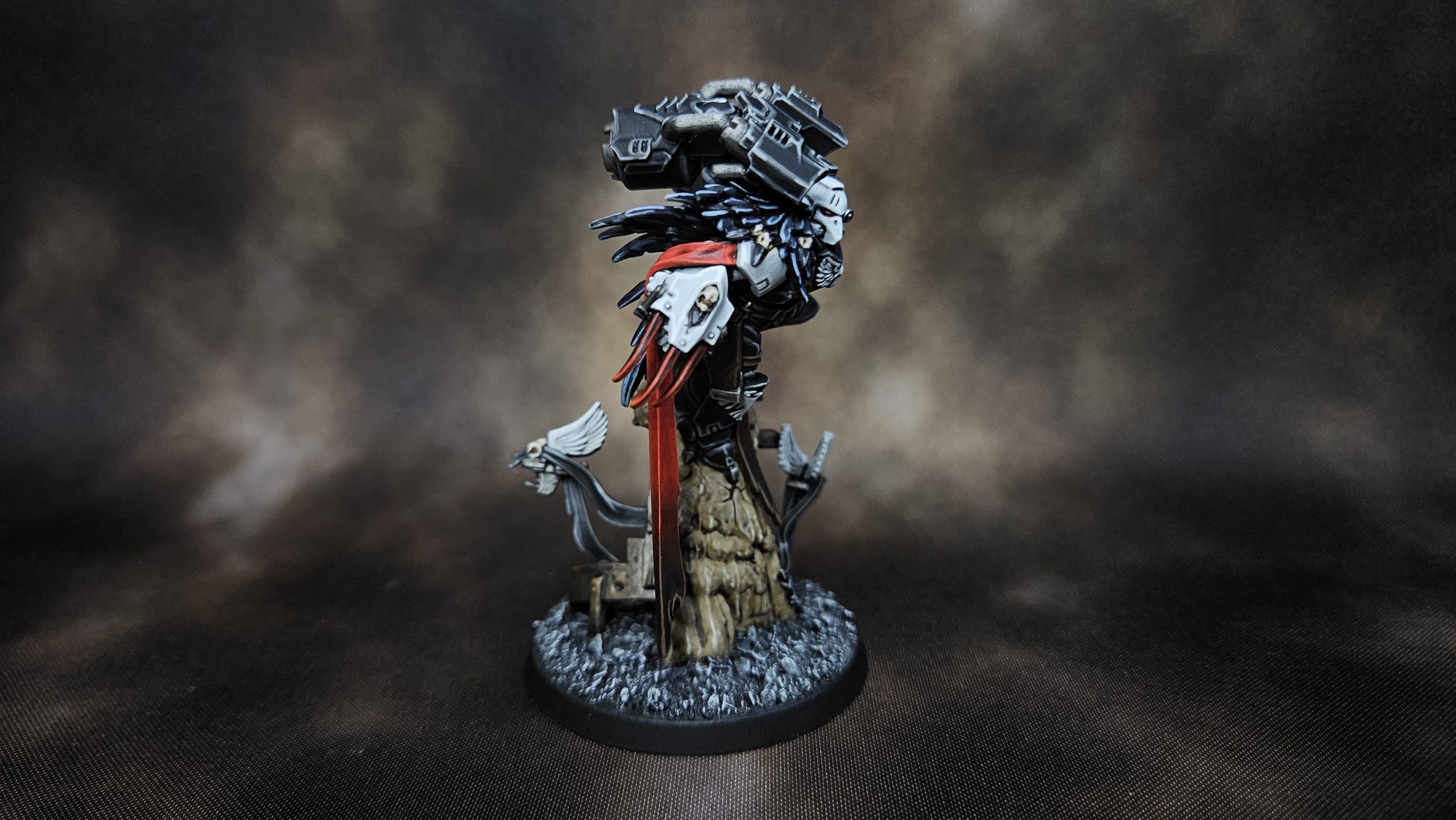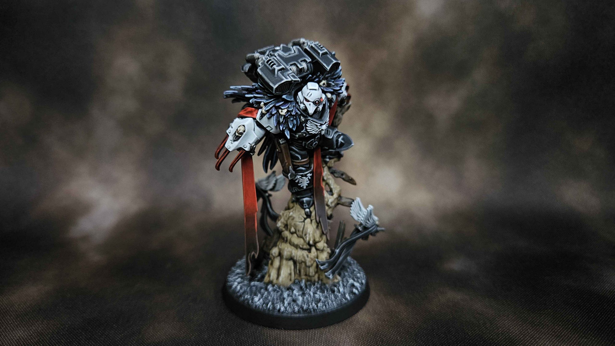 As the local Raven Guard sicko, this guy hits all the high points: jump pack, cool beakie helmet, insane pose, and a ridiculous hero rock. I tried to go for an iridescent look on the feathered mantle, and had a lot of fun figuring out how to do that. Also, he rips shit on the battlefield, which is a nice plus. One bit of advice though, if you plan on painting him: leave the arms and streamers off!