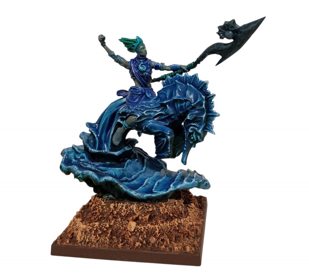 I love the Marid Sahar from Conquest (the Last Argument of Kings). The challenge of trying to paint a water djinn riding on a magical seahorse (made of water, of course) was irresistable to me. Trying to build up both within-element contrast (ie. shading and highlighting) while also defining between-element contrast (ie. visually communicating the differences between the seahorse, the djinn, her clothes, jewellery and weapon) all while working with a very limited colour palette (blue, light blue, dark blue, slightly purplish blue and a hint of green) was a great way to stretch myself as a painter.