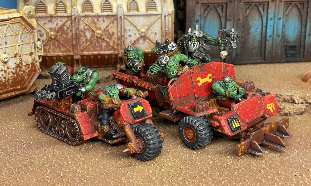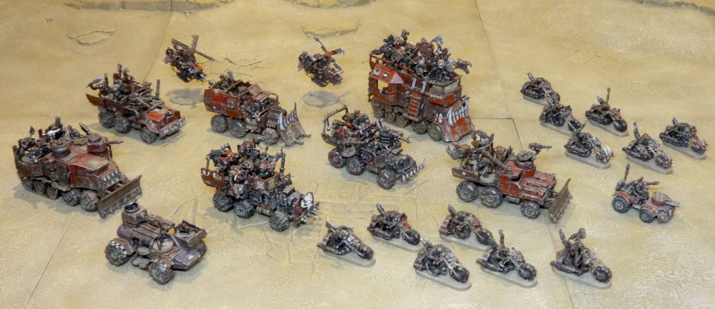 Gorkamorka mob mounted up in their trukks. Credit: 40khamslam