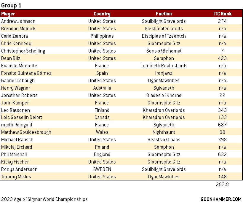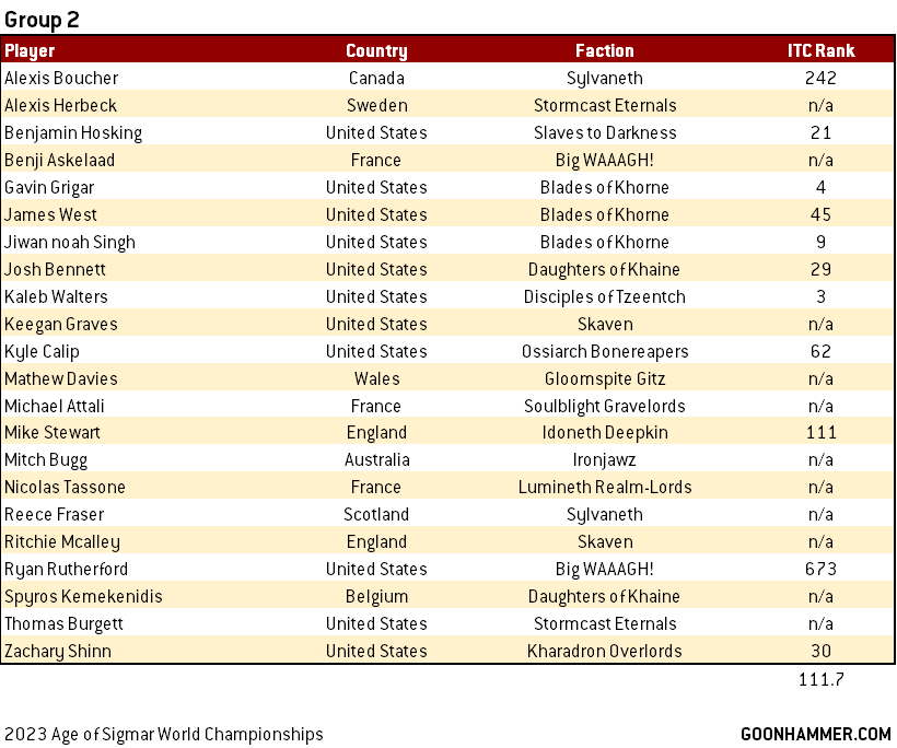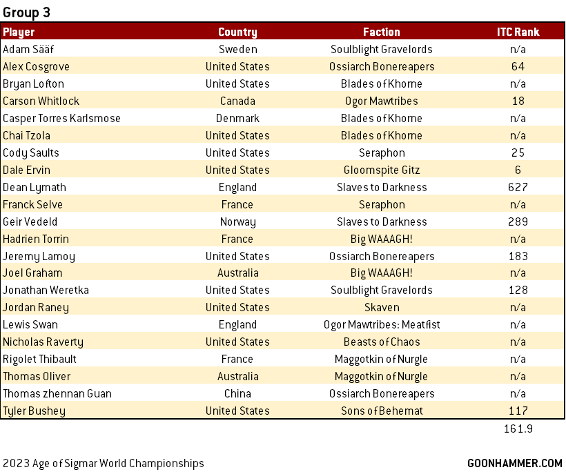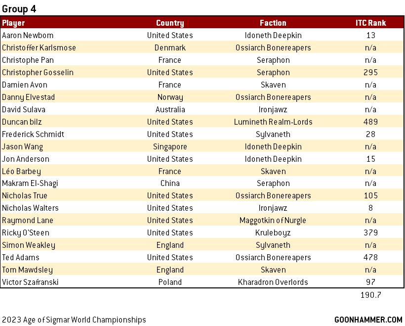 Another very competitive group, though many more lower ranked players than Group 2 to balance it out. Aaron Newborn, Nicholas Walters, Jon Anderson and Frederick Schmidt are all big competition for the Americans. The high concentration of Idoneth Deepkin and Bonereapers is notable here, with a lot of glass cannon vs iron walls, so a lot of it will likely come down to missions.