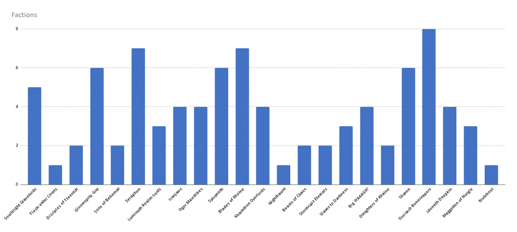 too shocking. At the top are Ossiarch Bonereapers with 8 and then Seraphon and Blades of Khorne at 7. Ossiarch Bonereapers have been consistent performers at the top tables, even post-ressurection nerf. Seraphon have maintained a strong hold on the game with the amount of mortal wounds they can shell out, and Khorne is a strong counter play in the current Magic-centric meta of this season.