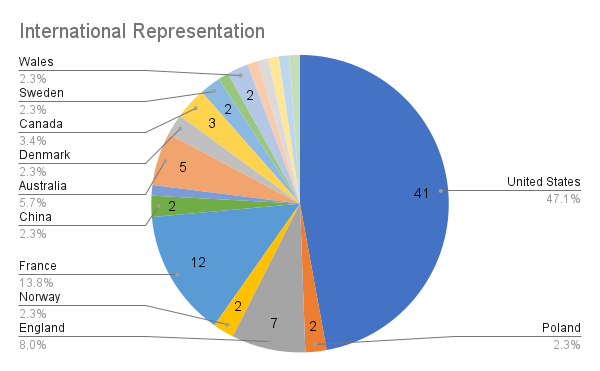 The countries that were too small to fit on the chart with only one entrant include: The Philippines, Belgium, Scotland, Singapore, Spain, and Sweden.