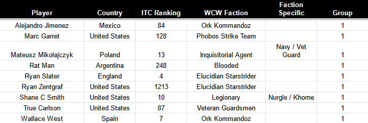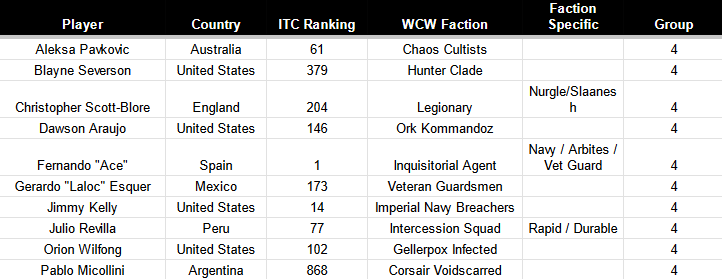TC: This group sees some obvious favorites, with both worldwide #1 Ace and last year's finale winner Orion. Orion’s favorite Gellerpox have seen a bevy of nerfs but he’s still one of the best to play the team. The two favorites meet a field with big names like KTO’s winner Jimmy, who qualified with Talons, now sporting the void armor of breachers. While players like Blayne and Pablo bring in some more out of the meta like Hunter Clade and Corsairs. This group notably avoids the multiple Ork players of groups 1-3, and sees a very healthy spread of team choices. It's honestly anyone’s game, but we at Goonhammer expect Ace to make it out.