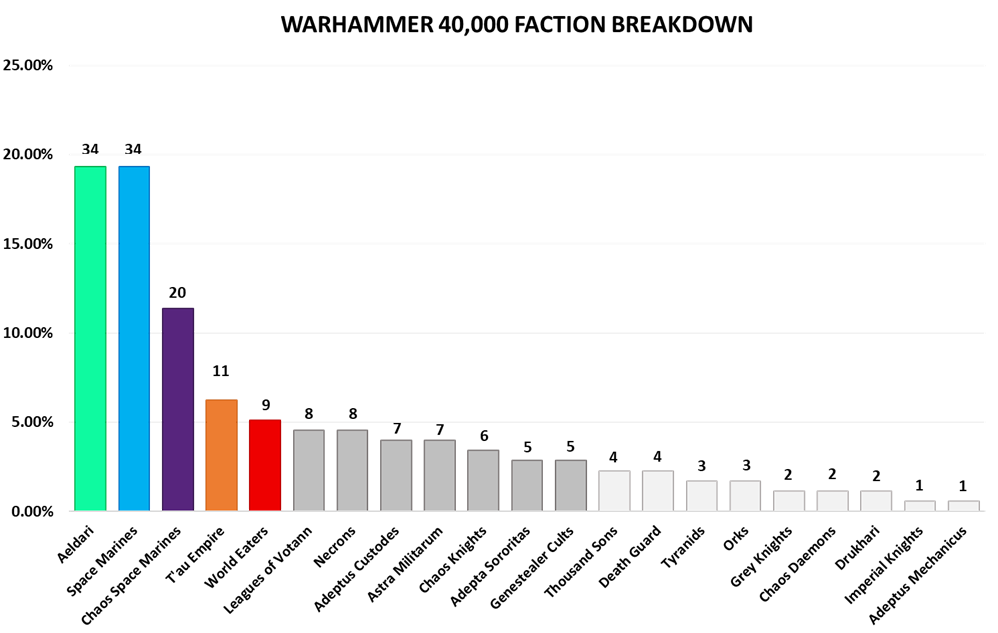 Every 40k faction will be represented at the World Championship. If you have been paying any attention at all to the Warhammer 40,000 meta, you could have probably guessed the three most common factions we’d see. At the top of the board are Aeldari, Space Marines, and Chaos Space Marines. Rounding out the top five are the Tau and World Eaters. In total and individually, these five factions are overrepresented and will comprise 61.3% of all factions played at the event. The next seven factions; Leagues of Votann, Necrons, Adeptus Custodes, Astra Militarum, Chaos Knights, Adeptus Sororitas, and Genestealer Cults are slightly underrepresented and individually make up between 3% and 5% of played factions and combine for 26.1% of played factions. The final 9 factions represented contribute 1-2% of total representation at 12.6% and are Thousand Sons, Death Guard, Tyranids, Orks, Grey Knights, Chaos Daemons, Drukhari, Imperial Knights, and Adeptus Mechanicus.