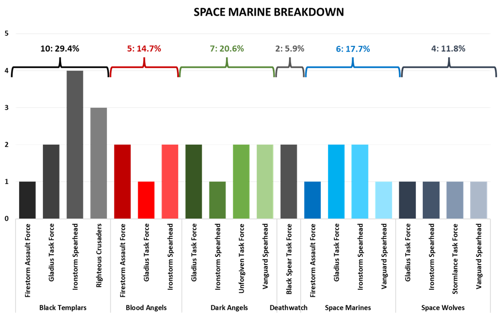 Space Marines being a popular faction is a surprise to no one, and they are tied with Aeldari as the most popular faction at the event. With a new book and a bevy of detachment options as well as their traditional chapter options, Space Marines will have a variety of looks and play types to offer opponents throughout the event. Here we can see the cross-section of those chapters selected by the attendees of the event, most prominent of which are the Black Templars followed by Dark Angels. In terms of the detachment types, the standout favorite is the Ironstorm Spearhead, accounting for just a hair under one-third of all detachments. Gladius is the second most common detachment followed by Firestorm and Vanguard as third most common.