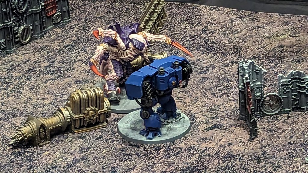 I moved my Ballistus Dread into position just behind the Screamer Killer locked in combat. While there will likely be stratagems and other rules allowing you to disengage and shoot (Editor's Note:Like the Combat Doctrines detachment rule recently previewed on Warhammer Community), those were not available to us for this demo, so Yvonmukluk pretty much could only leave his dudes in combat.