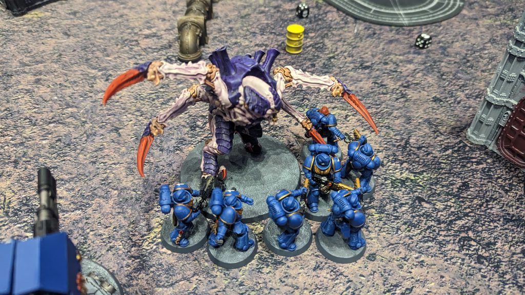 The first taste of 10th Edition has left me wanting more. The guns on the Ballistus felt powerful - not powerful enough to be overwhelming without a little favor from the dice gods, but enough to make it feel like I was able to take out a non-trivial amount of the opponent's force with some good rolls. Likewise--and even more importantly--everything felt tough, but not unfairly tough. Everything in this demo game was forcing 5+ saves when shooting what seemed to be their "intended" targets - the 'gants had to roll well against a lot of dice, the Screamer-Killer had to get lucky to not get vaporized, and the Marines felt like they were a little out of their depth against a giant monster. I thought it was fun and balanced. Had the Marines the first turn, they could have shot the other side clear off the board, but would have needed a fair a bit of luck to do so.