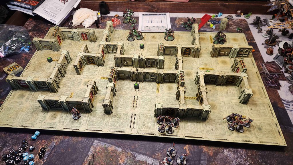 - Escape the Collapse: The attacker has to reach the other side of the board by the end of the game, while the defender drops collapsing debris onto the board. Attacker scores points for the total points that were able to escape, while the defender gets points for destroyed units. The Dais also start corrupted so there’s a chance of losing models for trying to scatter around the map.