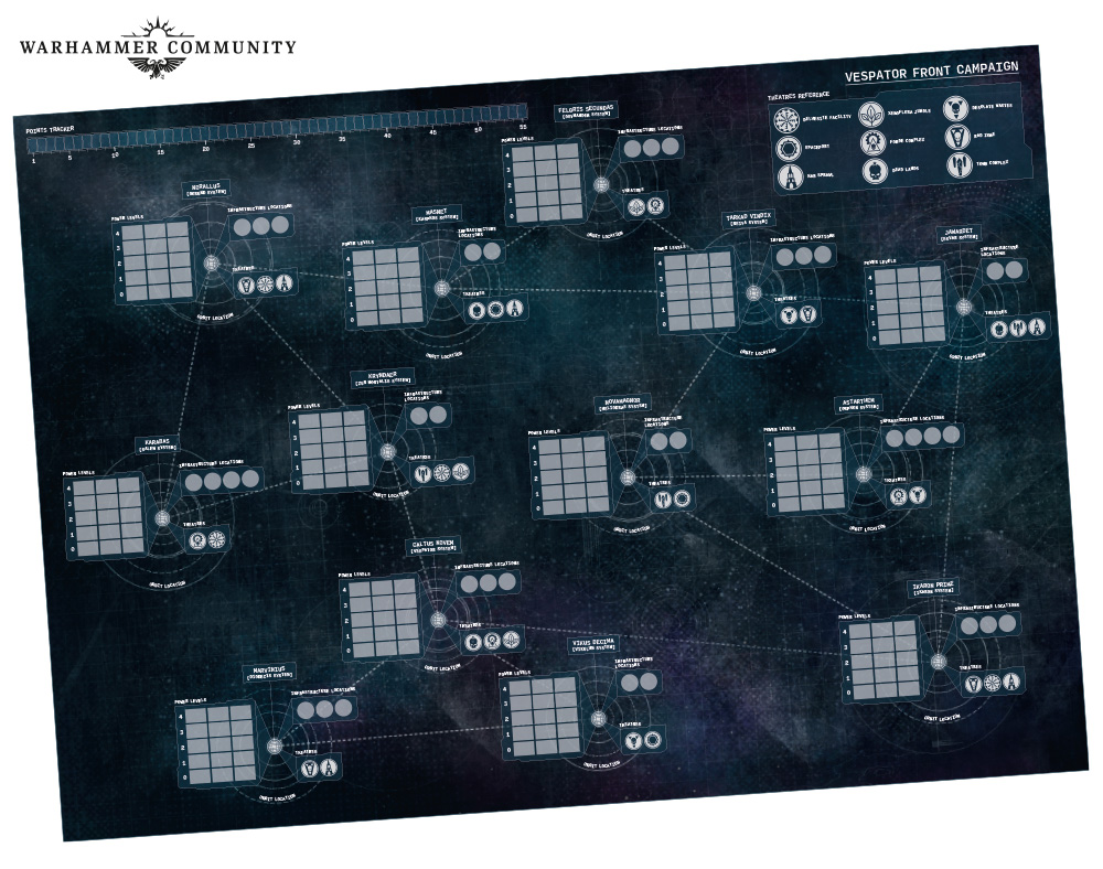 The Vespator Front campaign is a map-based campaign in which players fight over a series of planets they create with various attributes. You know all of those “create a planet” mechanics from the Crusade rules? Imagine those applied to a whole campaign with multiple planets. The campaign is recommended for three to twelve players, played over a four to six month period. GW recommends/hope you can find time to play two to three games each over six campaign phases. They suggest doing this over four to six months but they’ve included plenty of levers and switches to speed up or slow this down as your group prefers.
