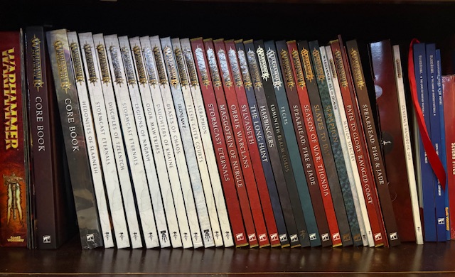 As a result of that experience, the Age of Sigmar section of my library now has one shelf that looks like so: