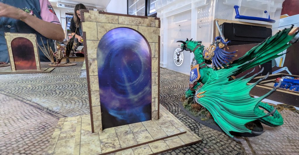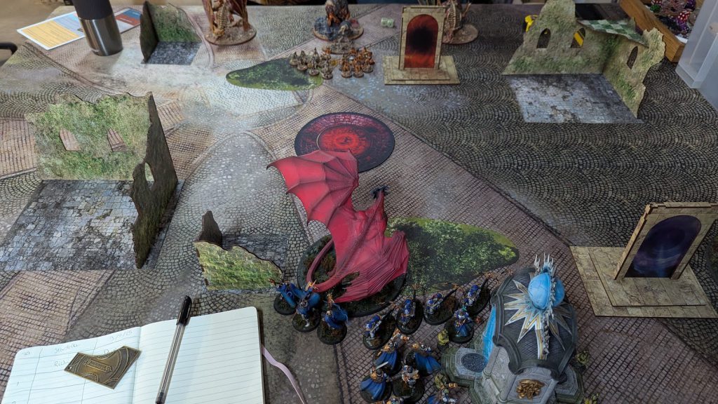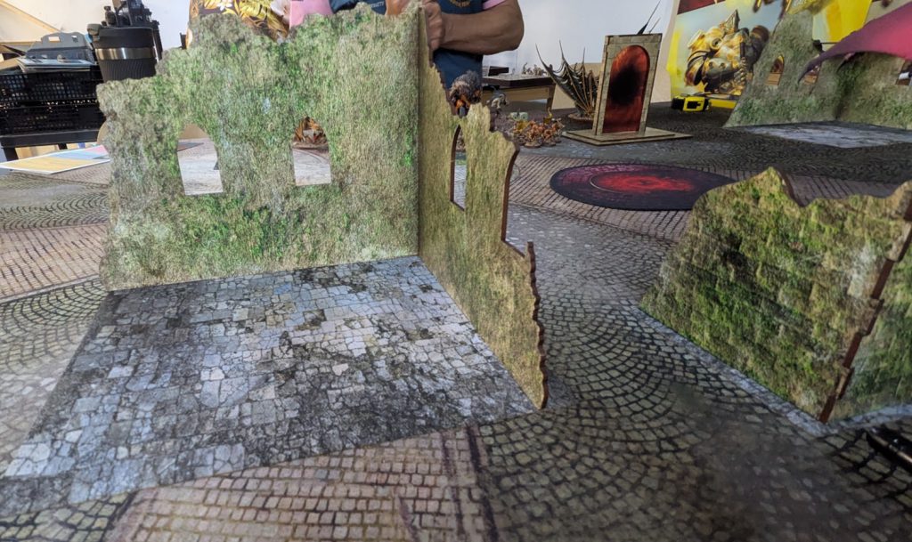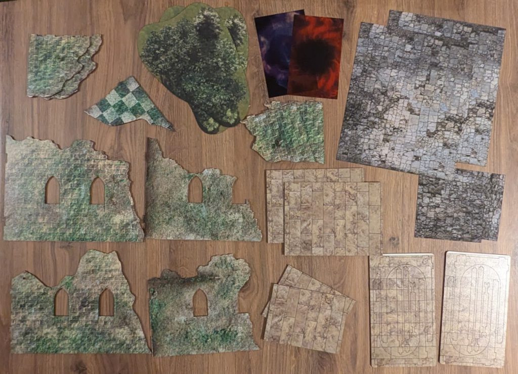 For me, I'm a big fan of the terrain set and really enjoyed the games I've played on it at the event and since. I feel that the fabric bases cover roughly the right amount of the table, the ruins really clearly block some lines of sight, and the arcane portals really stand out as Places of Power, but are also sized correctly to use as obstacles if a battleplan's terrain map calls for it.