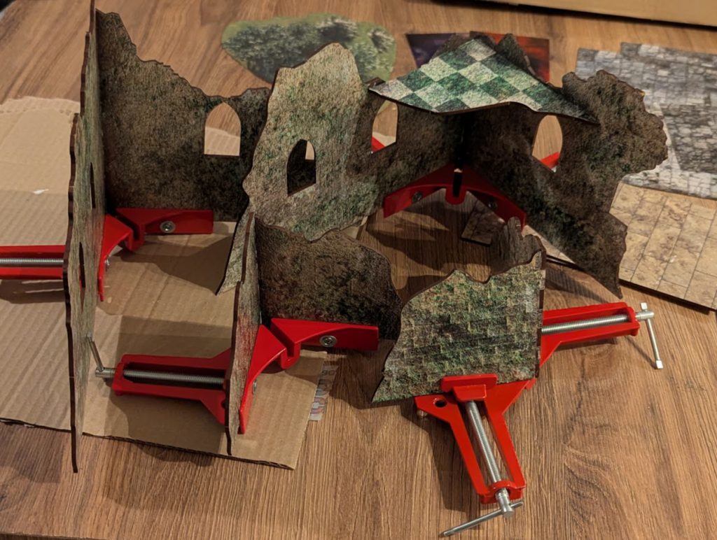 Building the ruins was a fairly simple task, given that three of them are just two walls with a corner join between them. The fourth ruin, one of the larger ones, also has a small triangle of upper floor to add some much needed 3d atmosphere to the pieces. After popping out a few windows, I set about gluing the buildings together with wood glue (regular craft PVA would be fine). One thing to note here, I was lucky to remember I owned some 90 degree corner clamps. This made keeping the ruins at true right angles much easier, as before using these I did find that they were a bit hard to align accurately. If you don't own the clamps, I'd suggest using something with a known right-angle to make sure the corner of each ruin is correct before leaving the glue to dry. An engineer's square is the obvious answer, but something like a book or a dice cube would work in a pinch.