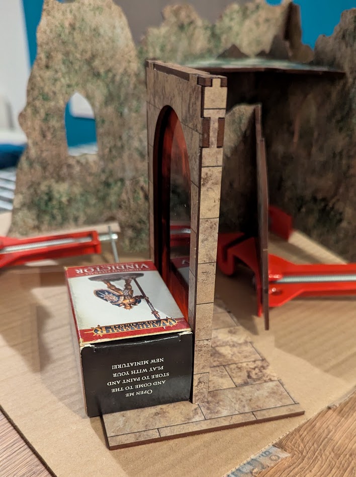 The portals were a little bit more involved. They consist of two face pieces and three long pieces that frame the edge, and this whole assembly then slots into a base piece. After a couple of failed attempts, my method was as follows: first use a few dots of glue to tack the coloured film in place on the inside of one of the faces. Take the other face and glue on the top frame, then the two side pieces. Attach the first face piece onto this assembly, then finally slot the whole thing into the base, gluing the joins first. I found that the pieces didn't locate firmly into the base, leaving my portal on a bit of a slant. My clamps wouldn't fit here, so I dug out the aforementioned square-cornered object (a GW Miniature of the Month box, in my case) to prop the portal up while it dried.