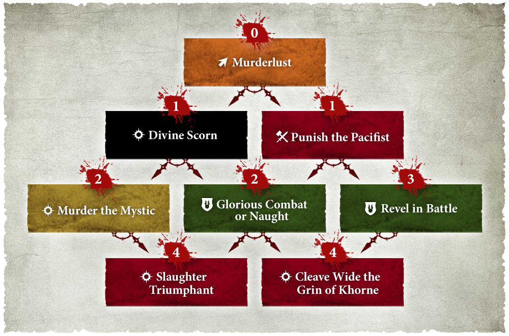 Murderlust. This was once the marque ability to the Blades of Khorne gameplan, allowing you to lock units down with out of sequence moves. Now it lets you reroll a dice on a charge in exchange for D3 mortal wounds. Definitely less impactful, but its also free and starts unlocked.