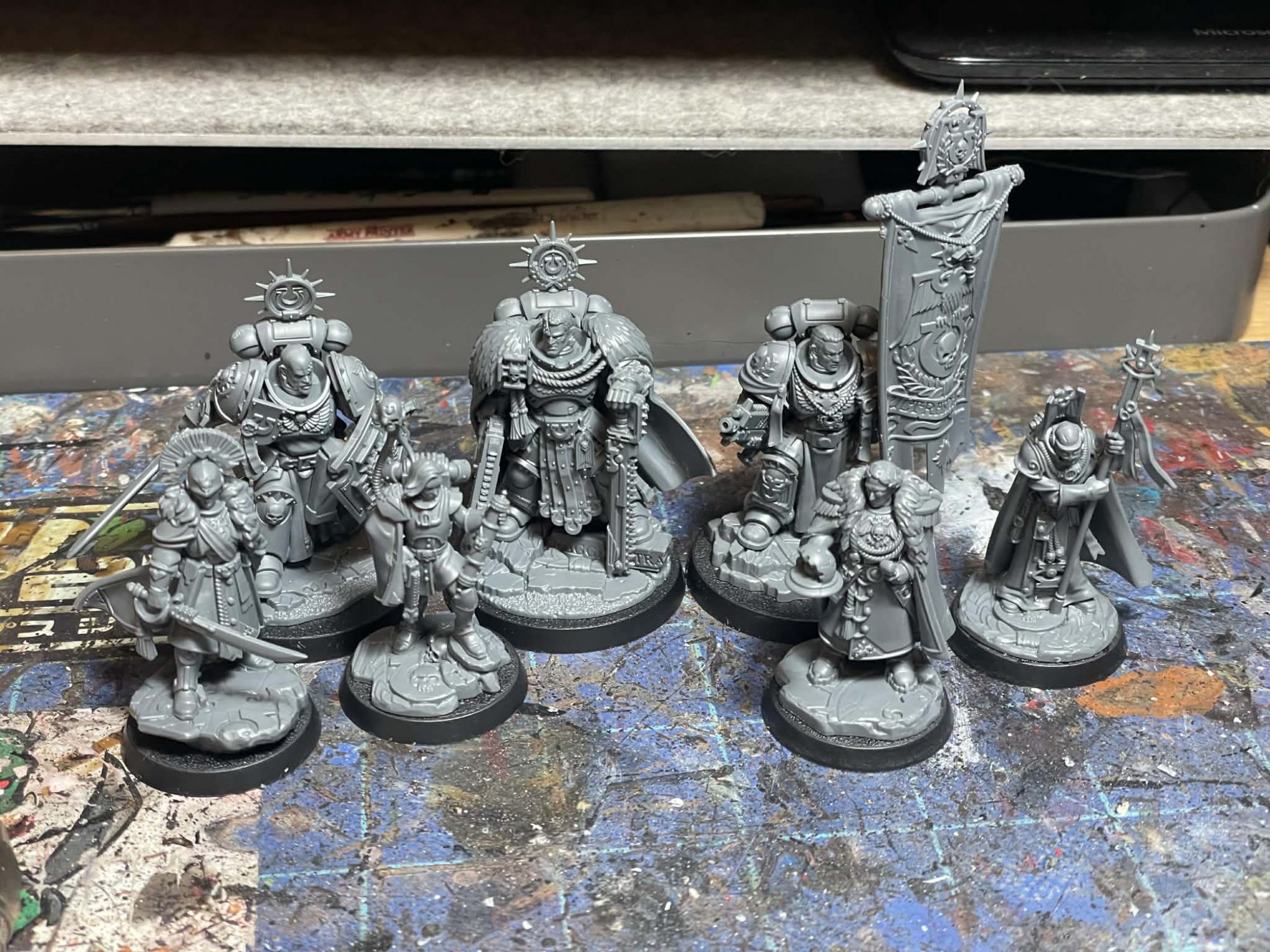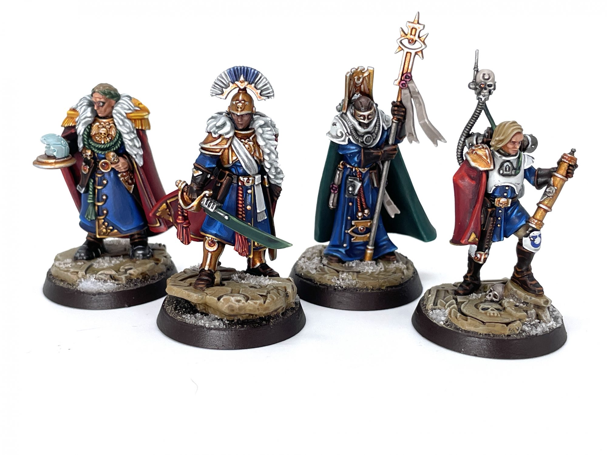 Getting behind the capes on some of these models was a bit of a pain. Their modeled bases overhang a bit, and since subassemblies weren't something I really wanted to deal with due to their construction, that meant early on I was just kinda ramming a paintbrush up there to at least pass at covering the primer and grey plastic with my cloak's base colors. Batch painting this crew is also an interesting exercise. The three Marines are likely going to be familiar territory for any Ultramarine player, but their human running crew present a new painting challenge. Unless you've been painting an Ultramar-flavored Guard army this whole time, these are new models with new details and new textures to work out. There's also the notion that you'll want these to tie in with your Marines, so finding the colors and materials you want to repeat across these guys and your other models is going to be the next challenge. You can obviously copy the studio scheme, but I went with a new recipe for their coats, using distinct blues from my power armor for a rich velvet look. Their capes were largely in the same reds as my existing Marine characters, save for a green cape on the Astropath. For their body armor, I went with either gold (if these guys aren't ready for the parade ground, I don't know who is) or white, echoing my 1st Company Ultramarines scheme. Leather and cloth were the same as I'd paint for the leather pouches and tabards on my Marines, further tying them to the power armored bunch. Mapping out the textures you want to do ahead of time helps with something like this, where it might at first seem daunting or confusing to get started.