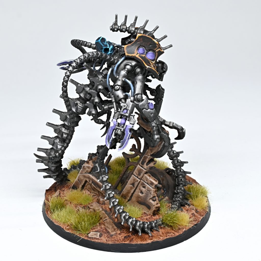 Wings: I did my standard Destroyer scheme on this, and he came together very quickly. While he is an intimidating centrepiece, a lot of the size comes from the base, and the actual model is basically just a Skorpekh Lord and Ophydian Destroyer mashed together. That meant I could just use standard Necron steel and gold recipes, Stormhost > Tesseract Glow > Ork Flesh for the gunblades, and Runelord Brass > Agrax > spatter with Blood for the Blood God on the claws/blades. My only complaint is that if you're painting him off the base he's quite "springy", so keeping the model steady for painting was sometimes a challenge. Very happy with the result though, and ready to unleash him on lots of foes.