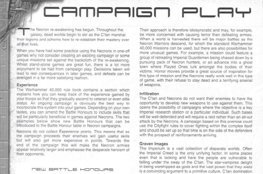 Mike: In a way GW actually addressed the antagonist problem in the Codex! Pages 60 & 61 include campaign ideas that provide motive for a Necron player’s army. It’s pretty generic stuff (the Red Harvest or Old Grudges) and still doesn’t necessarily help an individual player define their army but it’s an interesting touch.