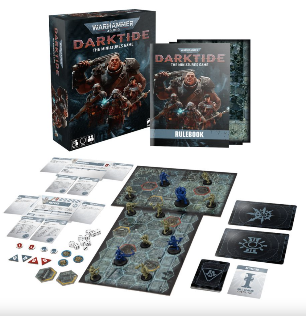 Darktide is a Kill Team spin-off game. While it is incredibly simplified, the bones are there. Shooting, wounds, and saves are reminiscent of full KT. The big differences here are that Darktide is played on a grid, and one of the gangs is controlled by rudimentary "AI". Enemy actions are goverened by simple rules, but the notion of