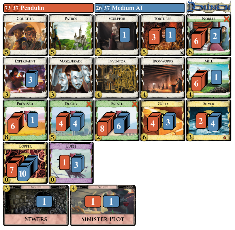 The slowest, and most aggravating part of sitting down and playing Dominion with physical cards is watching your opponent slowly cycle their entire deck three times in a single turn, only to buy a single Gold and pass. It takes ages, and you're just sitting there, watching them slowly tick through a mental state machine. This has been entirely eliminated in the app, you can blaze through your actions just about as fast as you can tap or click, and the AI finishes their turn in the blink of an eye.