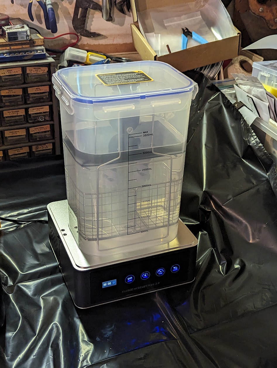 For the washing configuration you take the gasketed vat and fill it with high proof isopropyl alcohol. The printed parts are either dropped in the basket, or kept connected to the base and place inverted as seen in the picture above. When in wash mode the motor in the base will rapidly spin the agitator in the vat and wash away any excess resin. The manual didn't contain any guidelines on timing, but I found that 10 minutes is more than enough. After time is up you remove the part or plate and allow it to air dry. Elegoo says that the washing liquid is good for up to 30 cycles, at which point it should be decanted into a container that can be left in the sun to cure. The liquid sitting on top of the cured sludge can then be re-used; the sludge is left to cure fully and then disposed of as general trash.