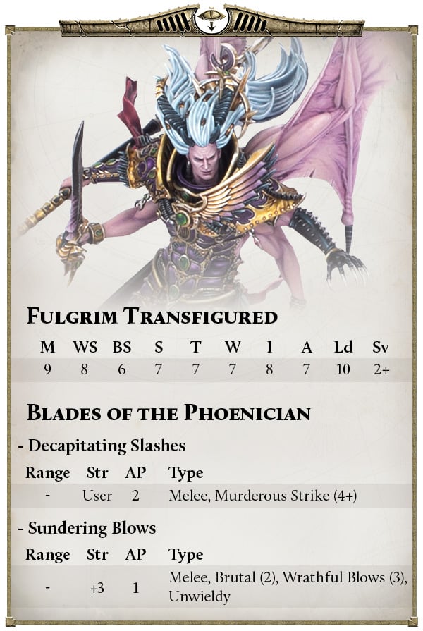 Fulgrim Transfigured has a great stat line, featuring mostly 7s and the occasional 8, which is better than any other Primarch with the possible exception of Horus. His wings let him fly 14” like Sanguinius and Corax, though he can’t