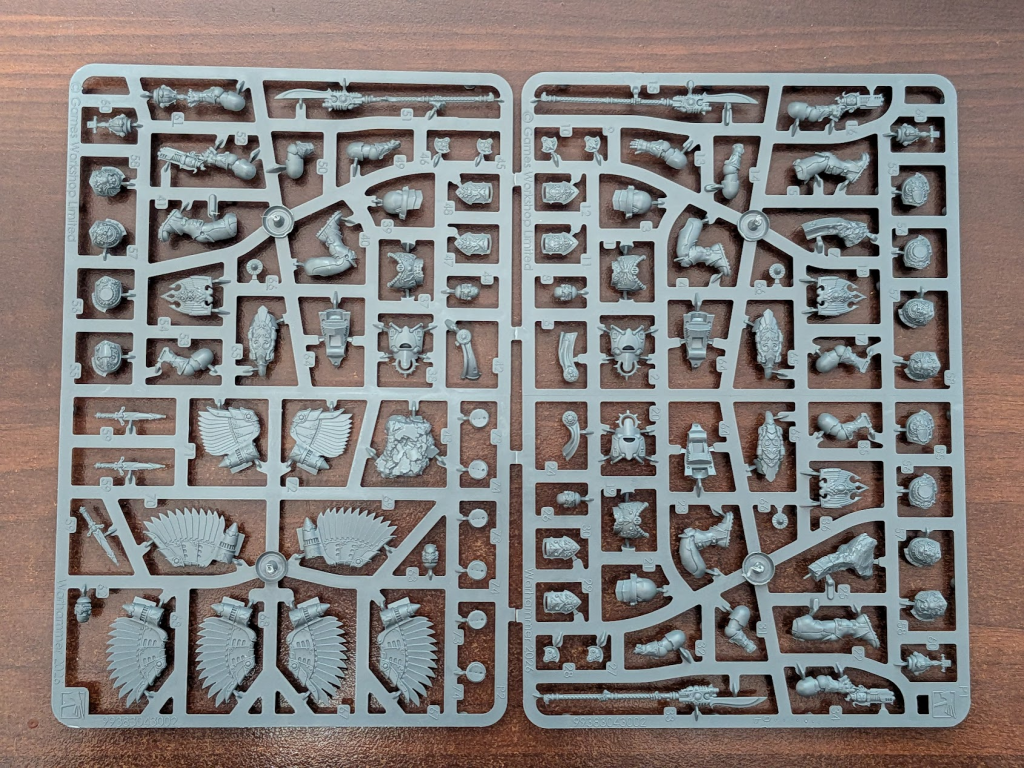 This new box contains six plastic Venatari. These are on two sets of identical sprues of three bodies, meaning you get two of each pose. Each sprue set contains options for both the Verutum Lances or the Destroyer and Buckler combo, with optional Neutronium Cascade Mines, so you can equip all your models with whichever loadout you prefer. Each set also comes with 5 bare heads, so you’ll have to pick your favourite to double up if you want them all with different heads. You also get four pairs of wings for every three Venatari so the spares are ideal for conversion fodder.