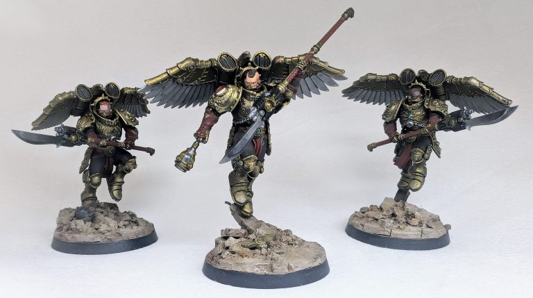NotThatHenryC: I also found these models straightforward to paint, though not especially quick. I’m doing bright clean Custodes* so I used Vallejo TMM Imperial Gold for most of the armour, with their silver for the details. I used the wash and highlight colours that come with those paint sets, which are a very good system. The jump packs are time-consuming with lots of twiddly bits to pick out but I think they look really good. At least there’s no cloak to paint.