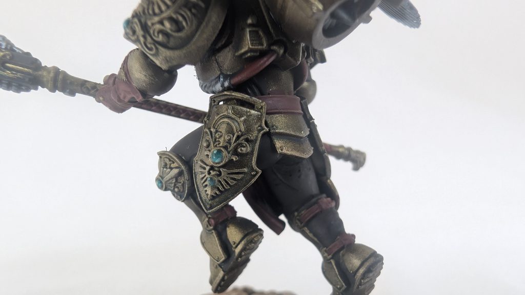 Once this was set I applied a recess oil wash of 1:1 Emerald Green and Shadow Brown (which in hindsight I could have been more generous with) to establish a sort of tarnished patina (yes I know gold doesn’t patina in real life, but maybe Auramite does huh?).