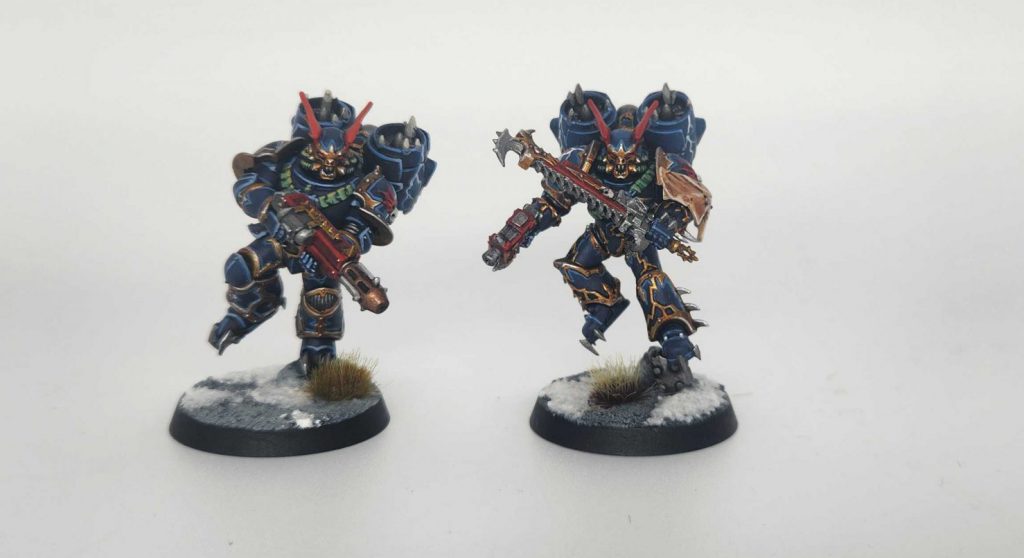 These models all have flat arm joins and socket necks, making it very easy to mix and match bits for them from other kits. In particular I made mine Night Lords and used bits from the Nemesis Claw kit, chopping off the wings to put on the mutated head for my mutant operative. The flat joins also make it easy to mix and match upgrades, and so I kitted these guys out for 40k, where they can take two heavy melee weapons on top of the champion’s power fist by putting a heavy melee weapon in the hands of the leaning operative.