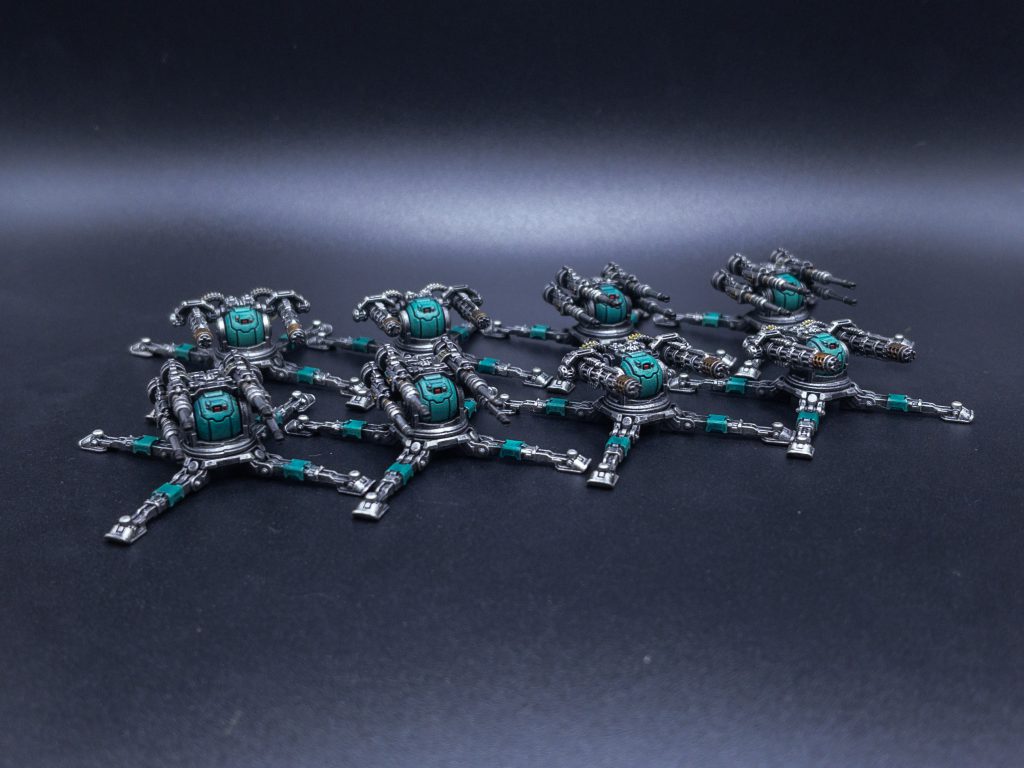 With the green down I clean up all the areas that will be black or metallic with a coat of Black Legion Contrast paint. The single pigment black works really well to kill the green and gives me a good starting point for the next steps. After that is fully dry, I drybrushed all the black areas with Eshin Grey to give them a highlight. Then I did a heavy drybrush of Leadbelcher onto all the weapons, the legs of the Araknae, and the tank treads. I highlighted this with a quick drybrush of Necron Compound, and then hit all the areas I wanted to be bronze with a coat of Snakebite Leather Contrast. The brown tone turns the silver into what I am looking for on all the melta tips, the details of the plasma, and any random banding I want to break up on the models. After that I hit the plasma coils with Tallassar Blue Contrast, to get me that blue glow that’s easy to read on the table. Now that this is done, I go back and hit all the trim with Runelord Brass, this took the most time on the infantry as they have trim on both the shoulder and shins but it breaks the model up and the pale desaturated tone of Runelord doesn’t distract from the vibrant sea green of the armor. I hit all the lights and viewports with Mephiston Red, and did the same on the flyers glass but layered it up with Evil Suns Scarlet and Wild Rider Red to really pop at a distance.