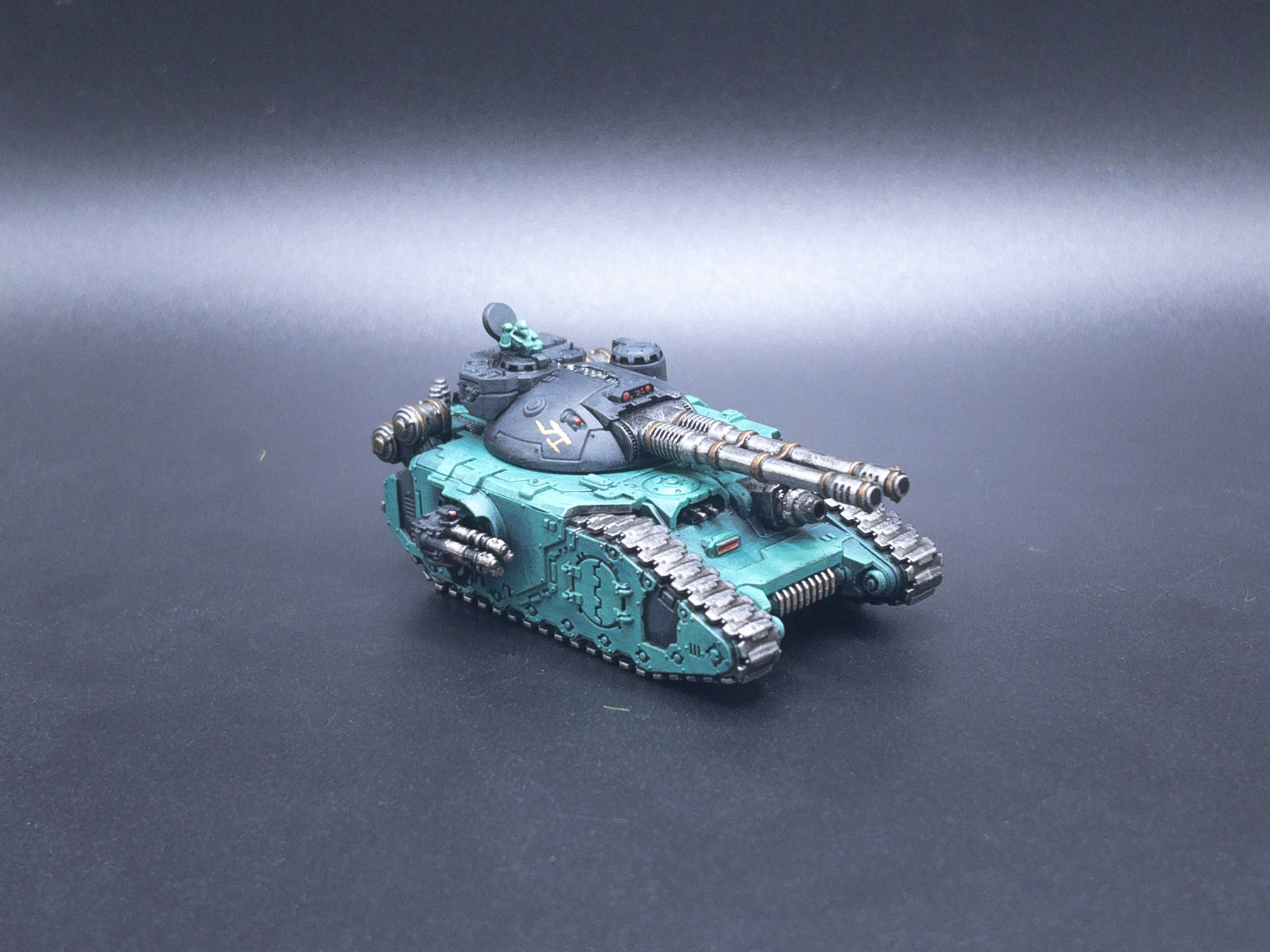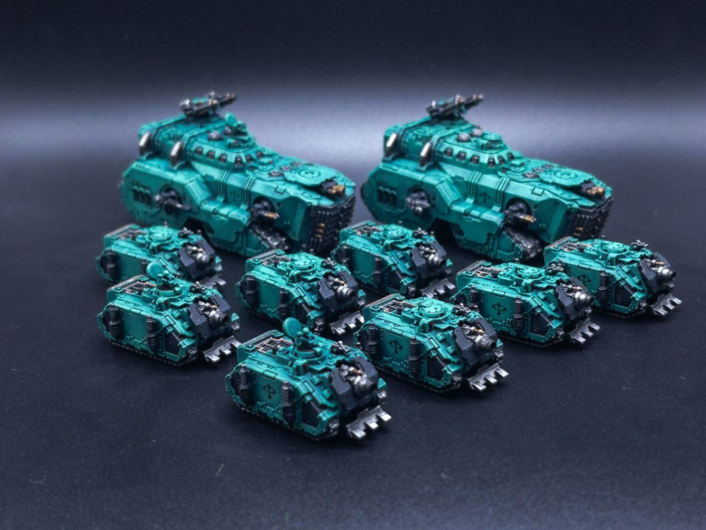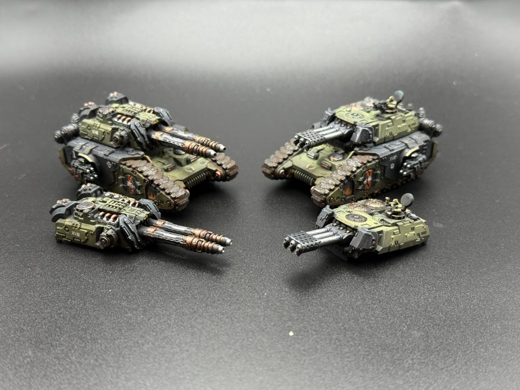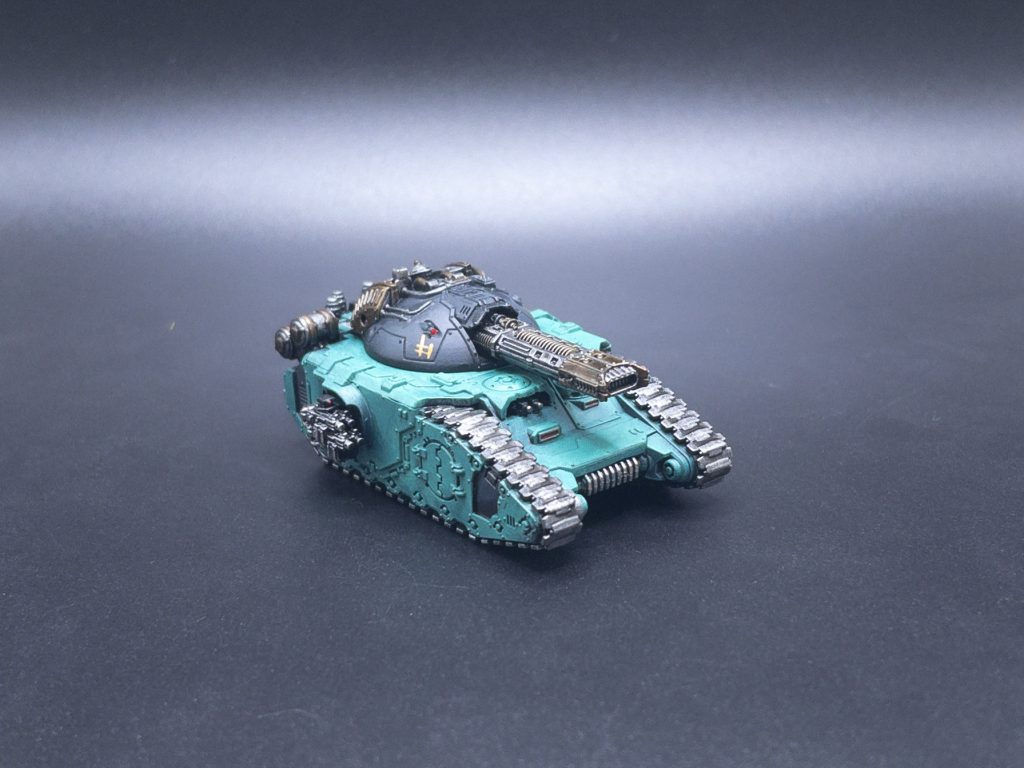 For painting I left the turrets off for ease of access to the main body of the tanks and painted them just the same as above. I wanted the turrets to be black and really stand out amongst the crowd of green armor on the table so leaving them separate made this a lot easier. I did a little more work on these compared to the other kits, coming back in with Runelord Brass on the banding of the Laser Destroyers and the Glaive to make them pop just a little bit. I also added some freehand mimicking the Cthonian gang markings found on the Heresy Sons of Horus transfer sheet from Forgeworld.