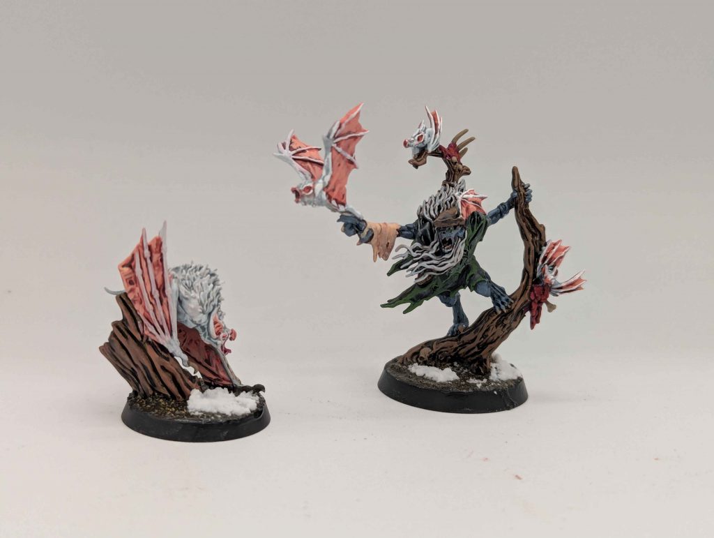 The pose on this model is nice and open (Grype’s wings aside) and I found myself enjoying it a lot. There was definitely a long stretch in the middle where half-finished sections really helped add to the idea that this is quite a busy sculpt, but it came together in the end and I’m pretty happy with him. Colour choices for his complement of clothing were a bit tough, given that ghouls normally get by with just a loincloth. In the end I opted for black and red to tie into the bats, which is also mirrored on some of my larger Morbheg Knights. Maybe he’s harvested some disgusting leather from a fallen mount?